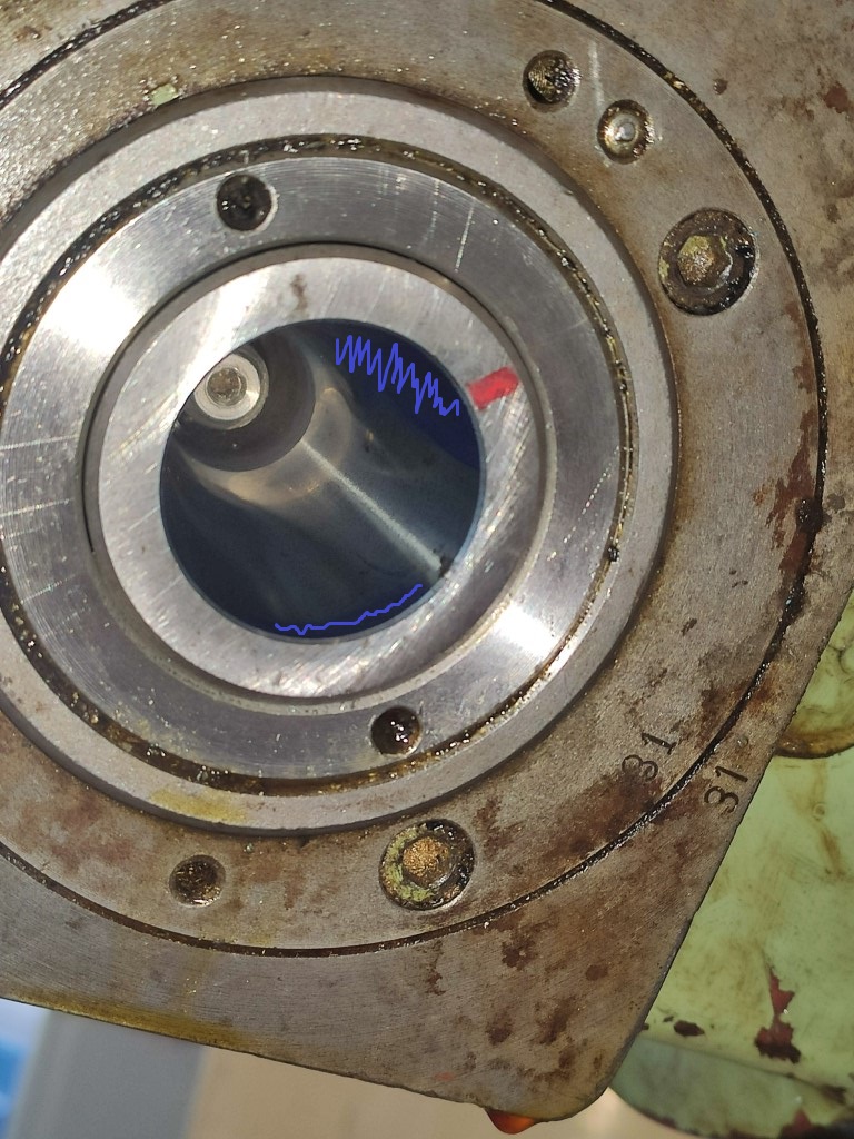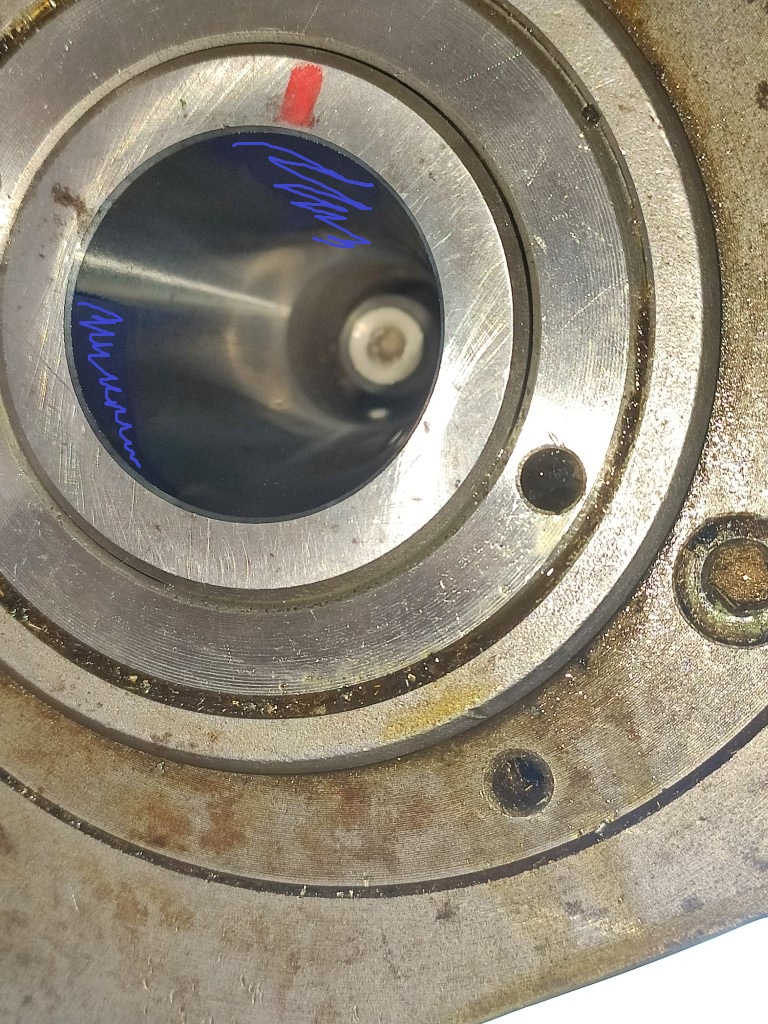 Ahoj, dnes jsem si všimnul, že mi hází nástroje upnuté do ISO30 kleštin. Zhruba 5 stovek u kleštiny, na konci nástroje to bude víc, je to vidět od oka. Dutina vřetena hází do jedné stovky (měřeno na spodku a i vrchu dutiny). V konkrétní kleštině problém není, dělají to všechny. Zkoušel jsem kleštiny s upnutým nástrojem opsat barvou do dutiny. Jedna strana kleštiny se opíše po celé hloubce dutiny, ostatní dvě strany kleštiny se opíšou jen na začátku dutiny. Snad to je patrné na fotkách. Všechny kleštiny se opisují stejně. Dutina je samozřejmě čistá a bez vrypů apod., zcela hladká pohmatu.