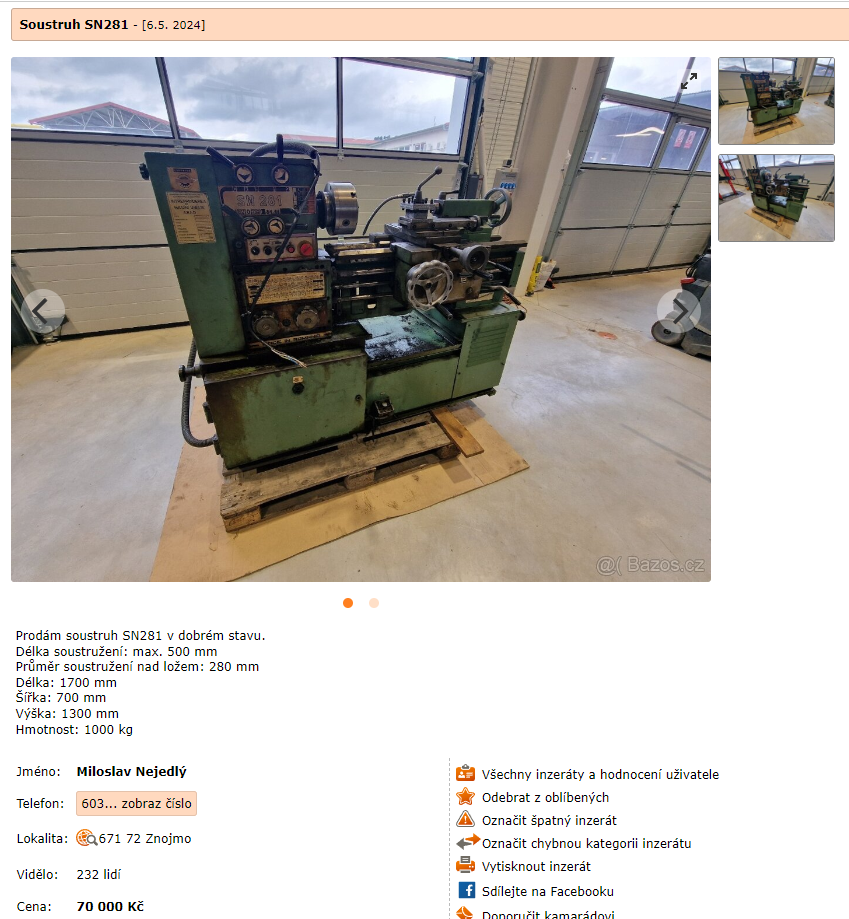 A když se podívám na nové, tak například ten Warco je okolo 220 tis. , ale zas záleží co tam je za tuhost stroje, jestli vůbec se dá nějaká kulatina s tím upíchnout...
