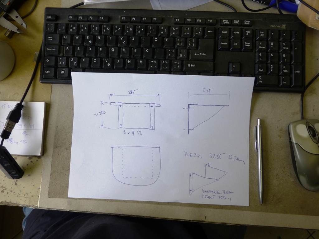 Materiál (2 podpěry a vrchní desku) si nechám vypálit, plech nad 3 mm stejně doma pořádný nemám a kruh bych do něj hlodal dost těžko. Chci, aby to trochu vypadalo. Pálení mám naceněné na +- 1000,- Kč včetně materiálu, to je za hubičku a budu to mít bez práce.
