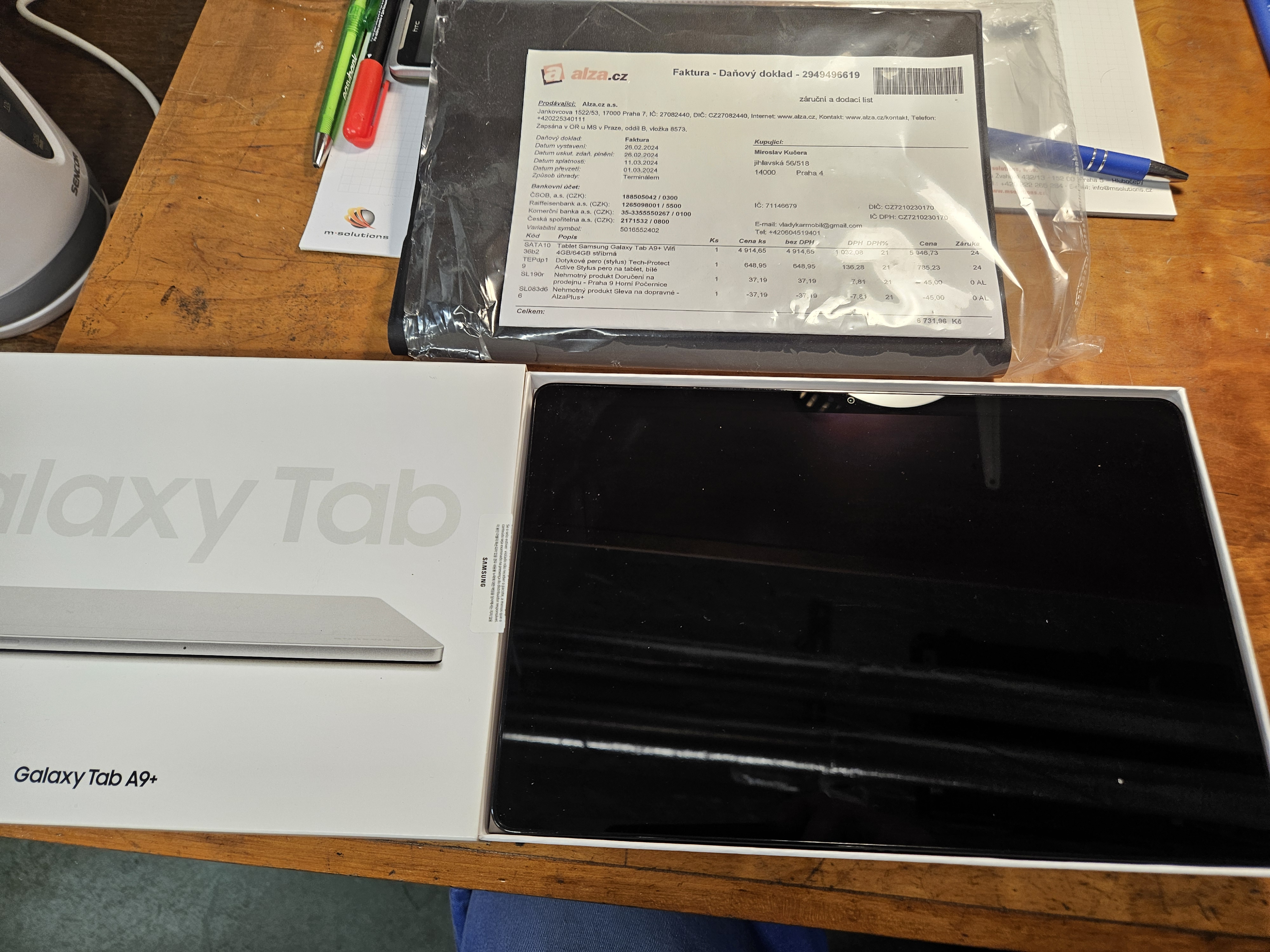 mám tu ještě skoro nový tablet samsung A9+, je koupený koncem února, takže ještě přes rok v záruce, je komplet, dokoupený sylus a obal. Kupoval jsem ho já pro zákazníka, fakturu mám pro reklamaci, ale není do účta. Stál komplet cca 6200 bez daně, na obal ji nemůžu najít, byl dokupovaný zvlášť. Je prakticky jen vyzkoušený, je to verze wifi, ne 4G, vidím to na cca 5000,- včetně zásilkovny