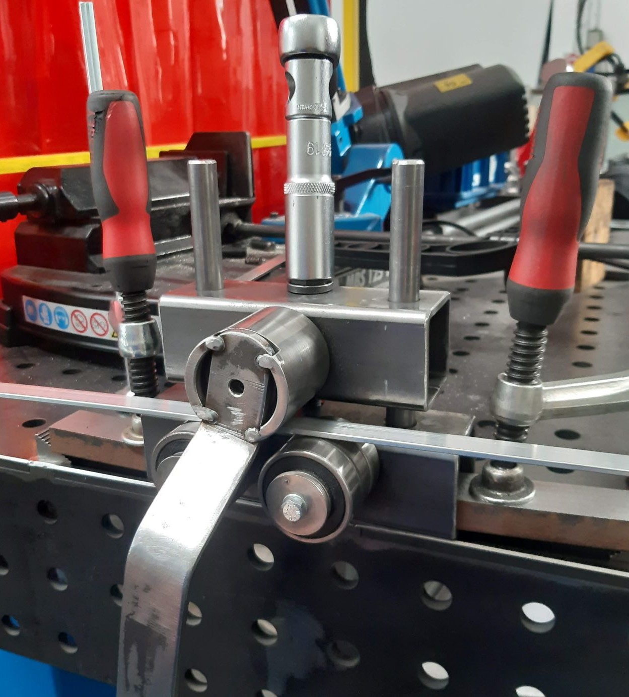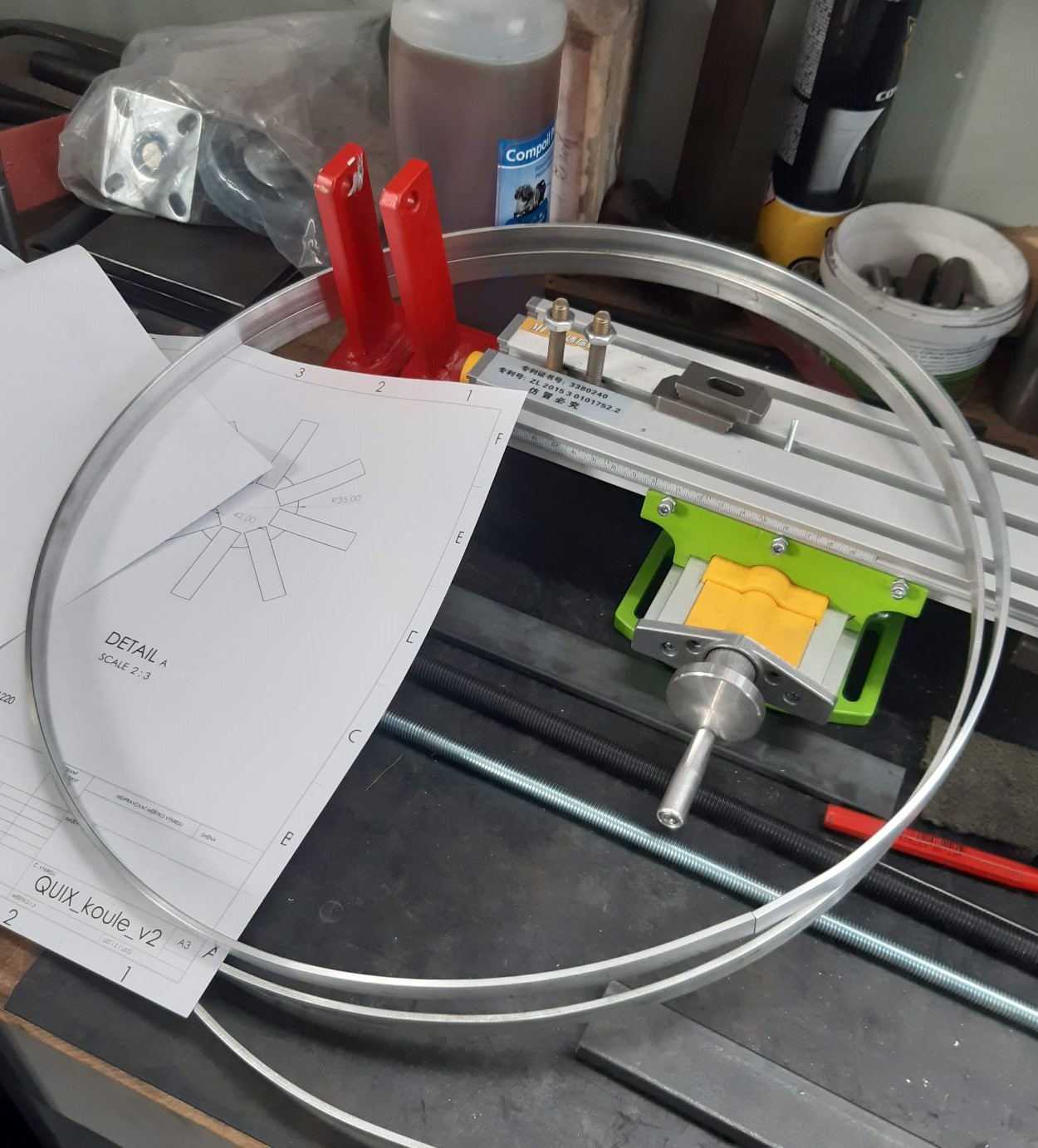 Také si tedy dovolím přispět a trochu se pochlubit, i když nic světoborného. Potřeboval jsem stočit kroužky z pásovinky 15x3 mm průměr 100 a 400 mm a obří stáčečka profilů takové titěrnosti nedává. Je to na ní moc malé. Tak jsem mrknul pod ponk do zbytků a za necelé tři hoďky jsem si vyrobil malinkou příruční stáčečku profilů, no a maká jak dráha :D