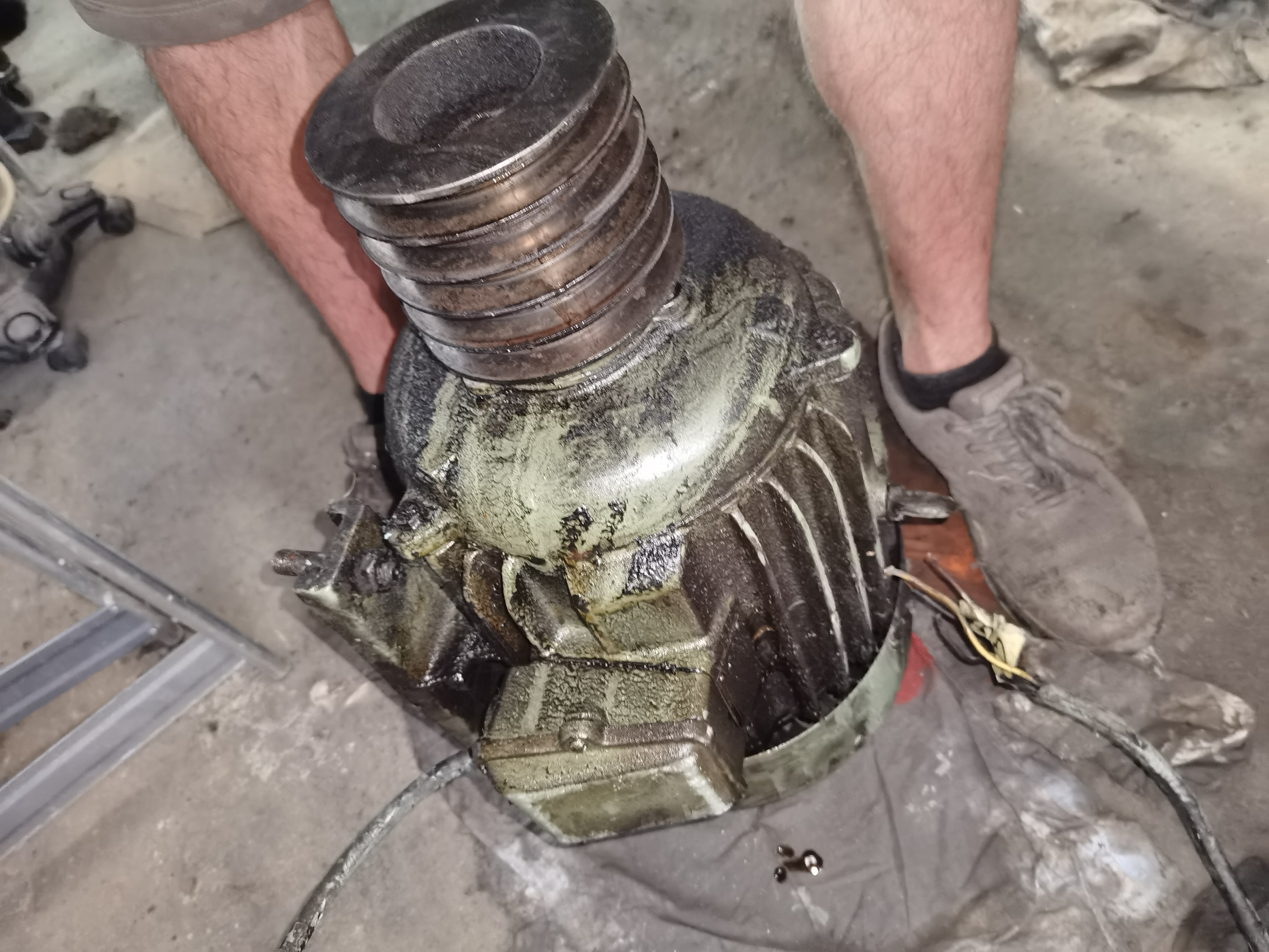 Stroj byl v takovém klasickém stavu. Posledních 20 let ho pravděpodobně nikdo nečistil, všechno běhalo na sucho (vřeteno, nortonka, suport), celkově jsem z něho při výměně oleje vypustil jen 2 litry.