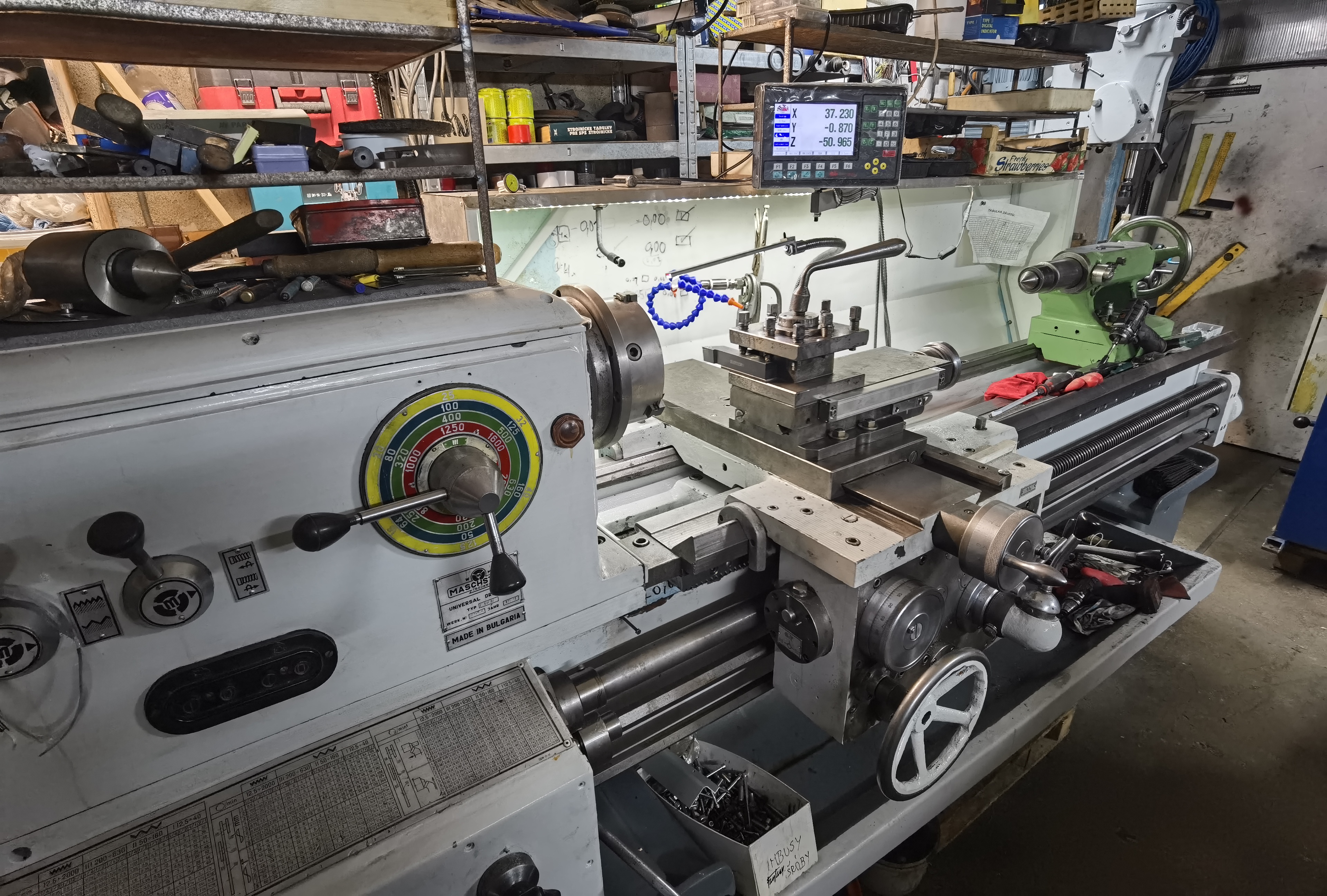 Veľmi pekne ďakujem, Stroj stále ešte "mazlím" pridal som mu zadnú stenu s osvetlením a regálé nad sústruh, keďže miesta na nástroje je málo, teda u mňa v garáži.