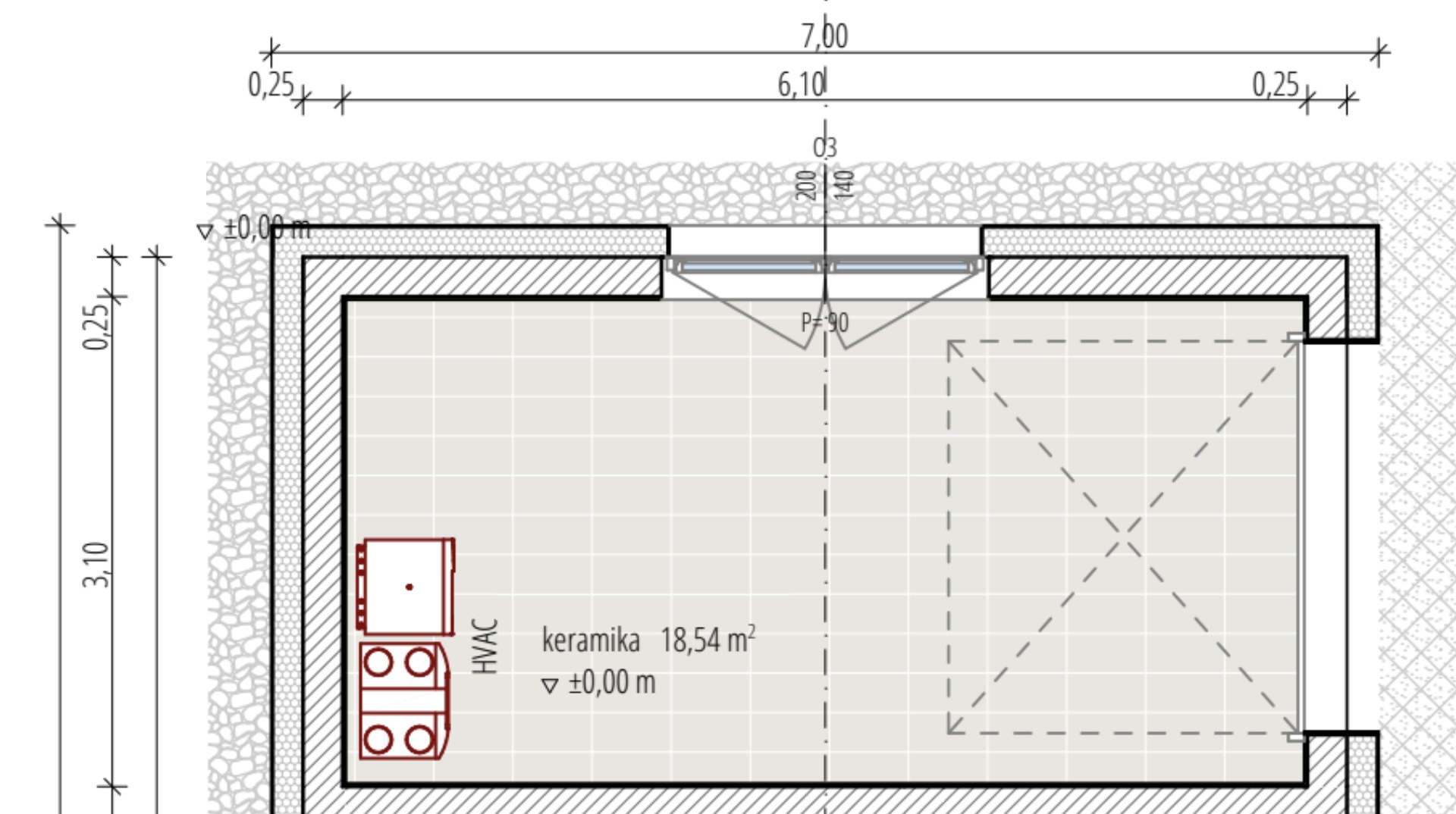 Vše (okna, dveře, podlaha, ..) je jen nástřel - tipuju, že tam architekt foukl nějaký "garáž" preset. Co je dané, jsou základní rozměry a že tam musim zkousnout to HVAC haraburdí. Zbytek je na mě.
