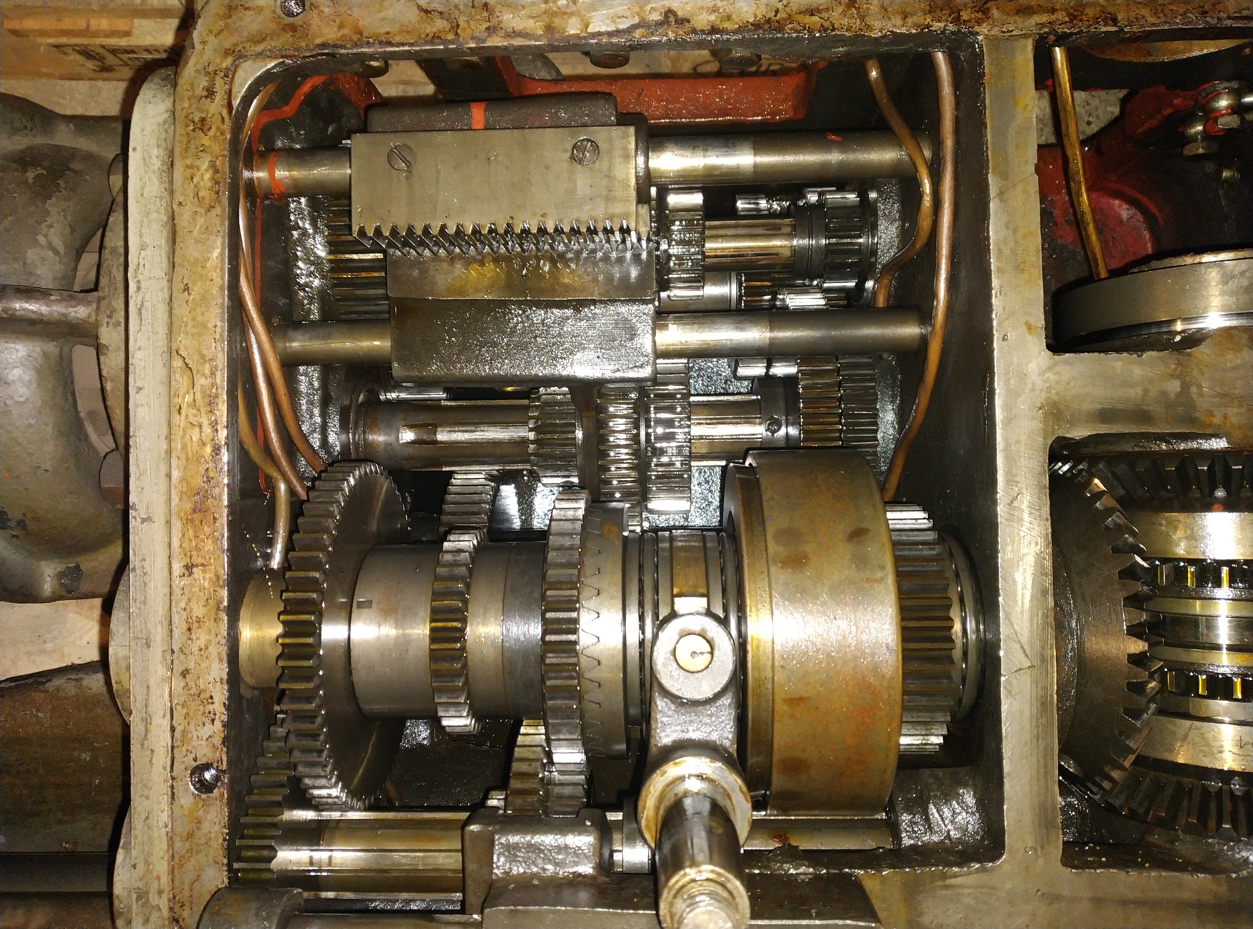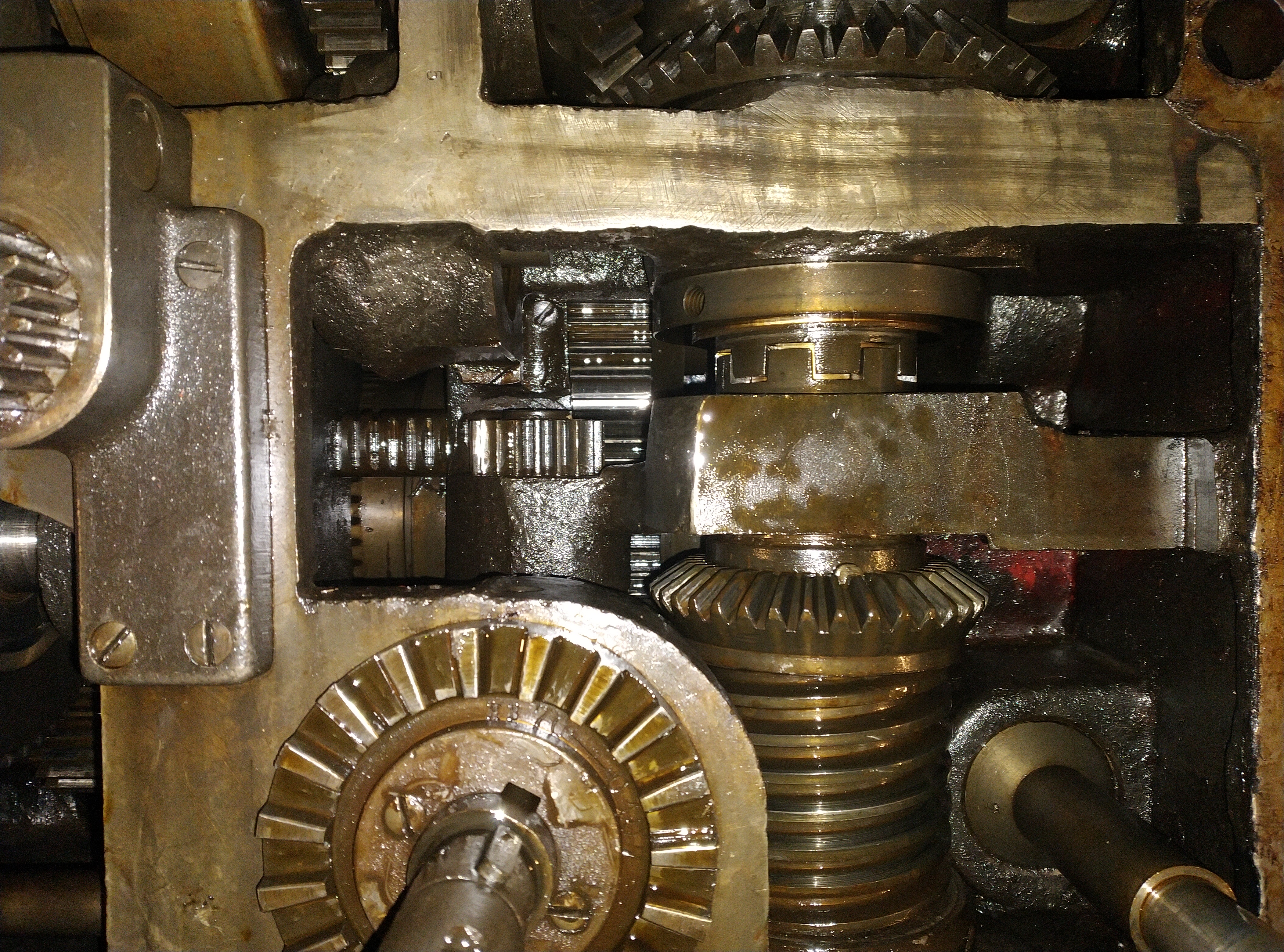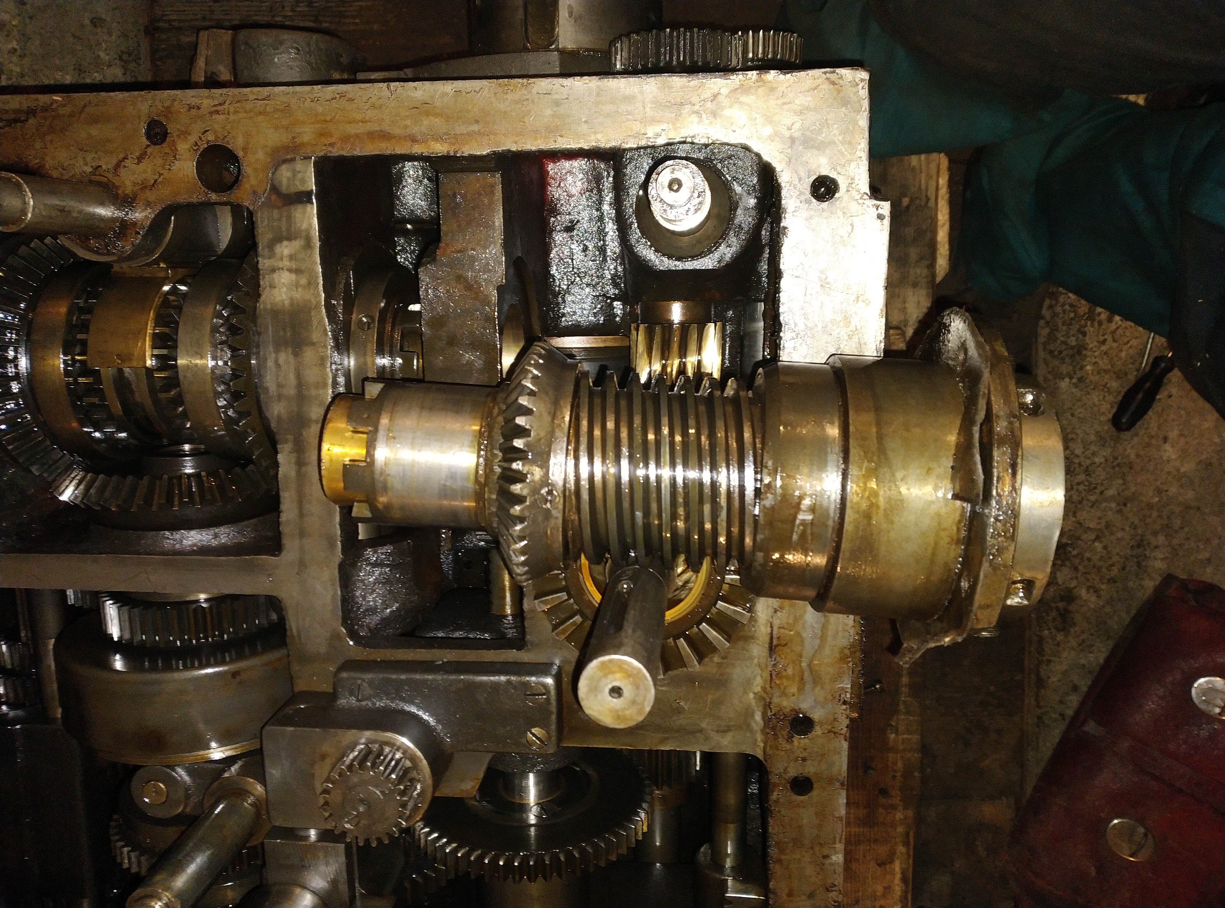 Mezi svátky jsem to nevydržel a zkusil trochu rozkuchnout vřeteník abych zjistil co bude potřeba vyměnit nebo opravit. Věděl jsem, že pod lícní deskou jsou očesaná dvě kola pohonu příčných saní, ale zajímalo co bude vevnitř. Počítal jsem, že minimálně budu měnit ložiska na hřídelích, ale změna je život. Celý vřeteník je na kluzných ložiskách. Takže pokud jsou někde větší než zcela zdravé vůle, mám dvě možnosti, buď to celé opravit někde jinde na horizontce nebo se s tím naučit žít a mazat a mazat...
