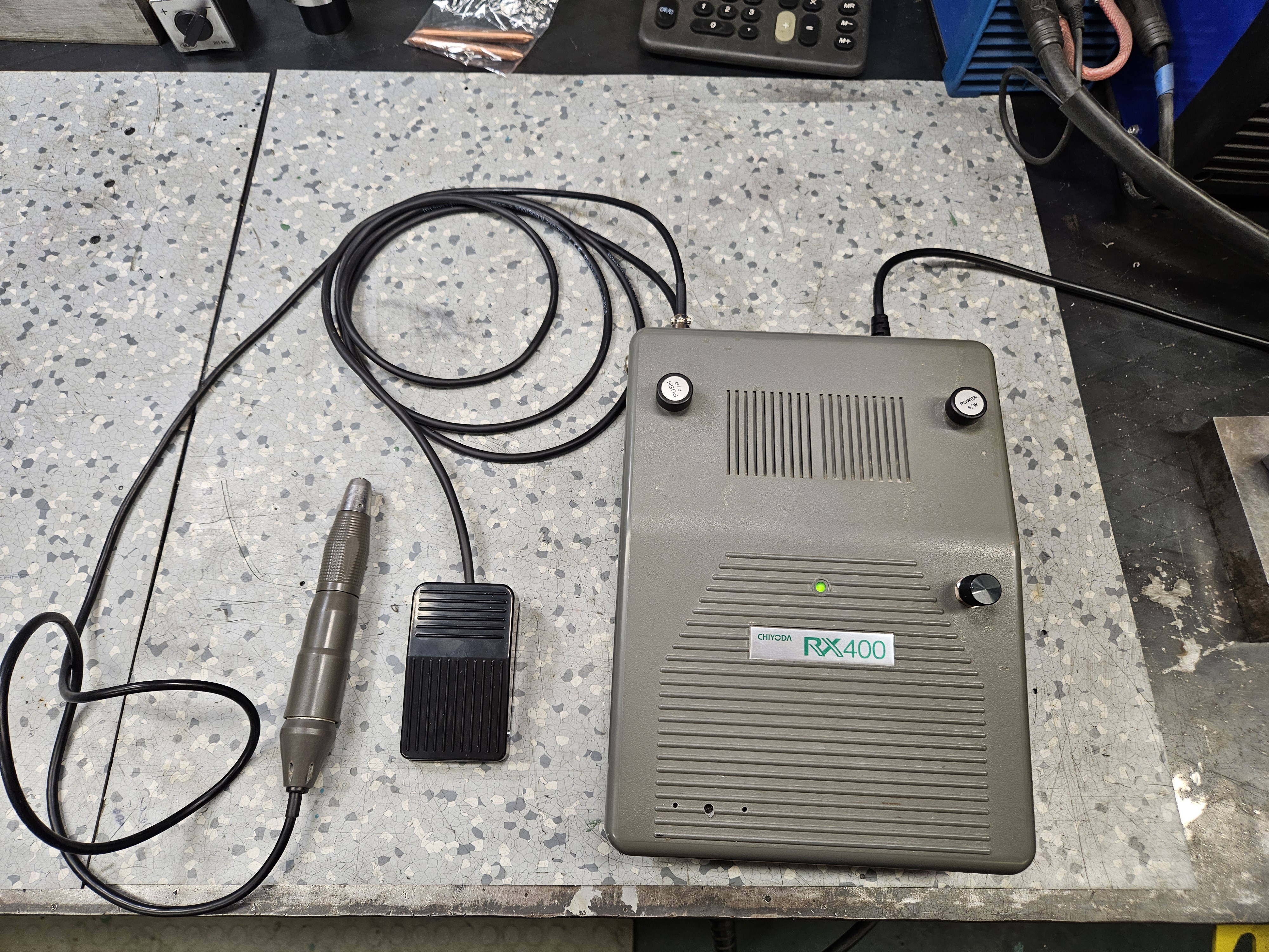 včera chvíle, dneska chvíle :D Asi japonská frézka ala dremel, ale sklíčidlo rychloupínací, provedení paráda, jen se japonec lehce zbláznil nad deskou řízení :shock: na to, že by stačilo cca pwmko, tak je tam asi procík, krystal, hafo pomocných obvodů, asi osm výkonových tranzistorů na chladiči... Prostě masakr :mrgreen: Mechanika, tu jsem vybral jako první neskutečná pastička na myši, asi nesmrtelná mechanika převodu. Je to od zubního technika, přinesl to kamarád, že by potřeboval upravit, nastavit si požadované otáčky a pedálkem jen spínat, v originálu to celé sloužilo jako šlapka ( ne kurva :lol: ) No povedlo se, odporový dělič a spínačem zkratovávaný poťák :)