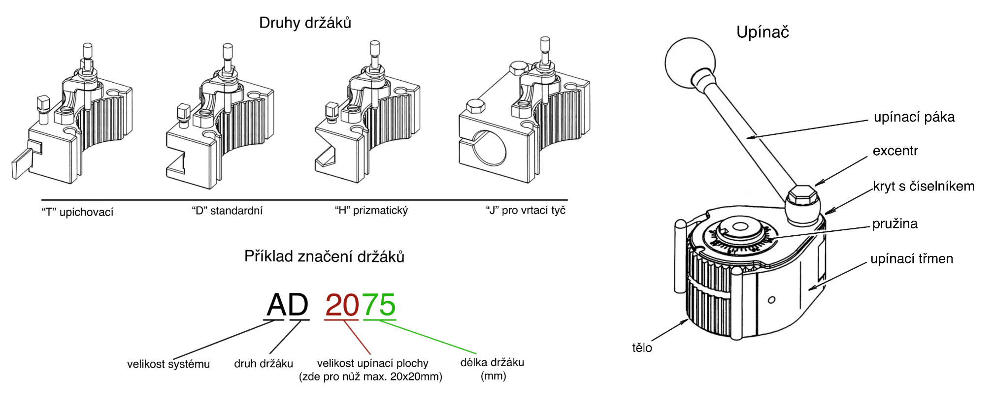 Držáky originálního Multifixu měly tvrdost zhruba 40 - 46 HRc. Nožové držáky mají také broušené ozubení, stejně tak jako tělo. Kromě nejmenší velikosti Aa se základní držáky dají sehnat ve více rozměrech - označení viz. foto. Délka držáku se má volit tak, aby byla co nejblíže k šířce nožového suportu. Neměla by být větší, aby nůž neměl zbytečně velké vyložení a snížilo se zatížení upínače. Pro velikost A se držáky dělají o délce 75, 85 a 90 mm. Držáky mají konzoli se šroubem pro výškové nastavení. Nastavená velikost se zamkne a i po výměně držáku výška souhlasí.