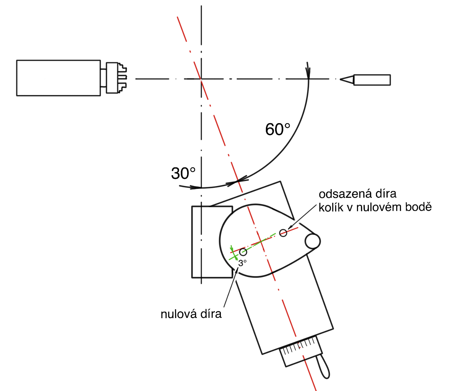 A 30° potřebuješ na to řezání závitů. Protože to je poloha vzhledem k nožovce, a nožovku máš vytočenou o 60°.