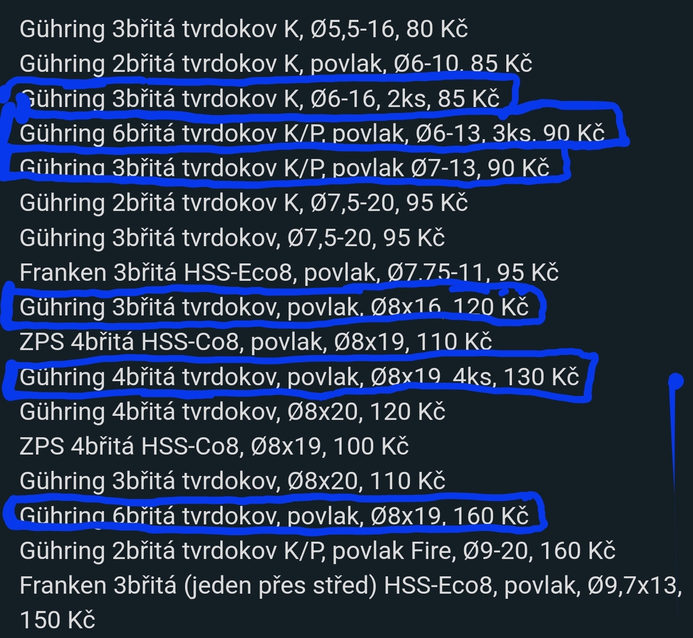 Prodám nové značkové stopkové frézy, většinou TK nebo povlakované. Ceny jsou za 1 kus, poštovné přes Zásilkovnu od 80 Kč. Minimální hodnota objednávky 300 Kč. V případě zájmu pošlu detaily.