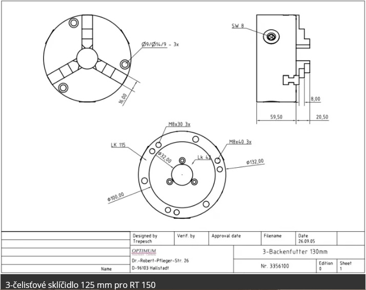 pristál u mňa bazárový otočák Optimum RT-150 (to isté predáva aj Vertex, Zentra atď.). Je na ňom cez medzprírubu upevnená 3-čeľusťová 130 mm univerzála, osadená vnútornými čeľusťami. Kedysi mala aj nejaký štítok, ten ale nieje čitateľný. Podľa všetkého je to skľučovadlo dodávané priamo firmou Optimum k týmto deličkám. Všade kde naň narazím, je iba suchý opis že je k deličke RT-150, ale nikde neviem zistiť, či je dodávané aj s opačnou sadou čeľustí a či sa vôbec niekde dajú zohnať. Podľa vzhľadu tipujem že je to nejaká čína, akurát s prirážkou tak 400%. Nevie niekto pomôcť?
