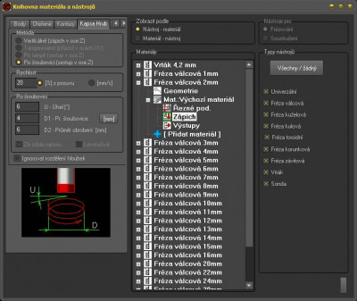 Knihovna nástrojů a materiálů, v knihovně jsou pod definicí nástroje i definice materiálu které obsahují řezné podmínky, zápichy a použití výstupů pro konkrétní materiál.
