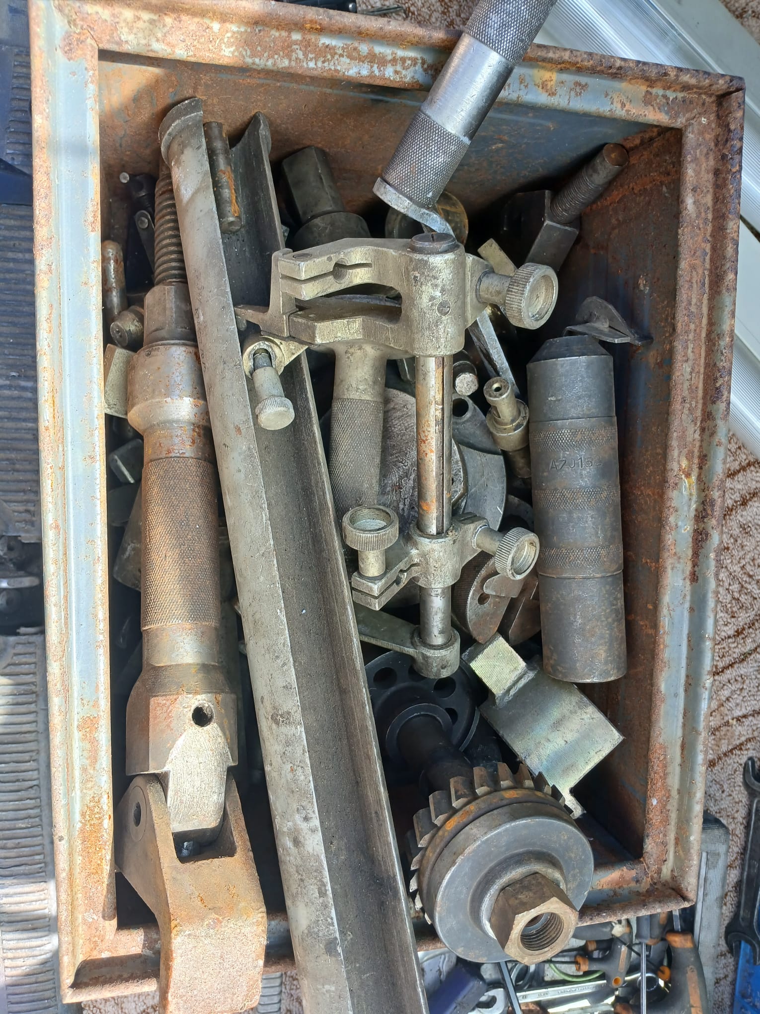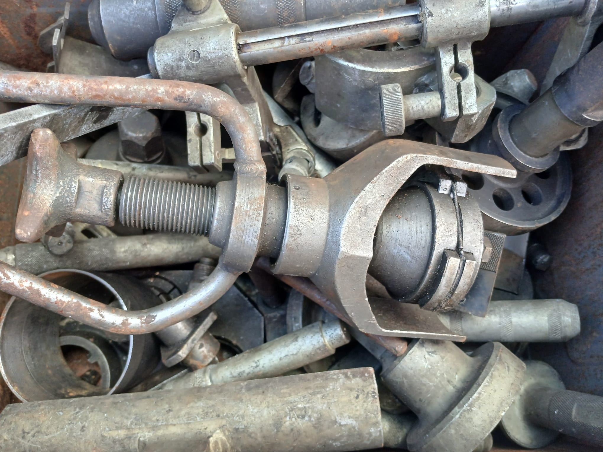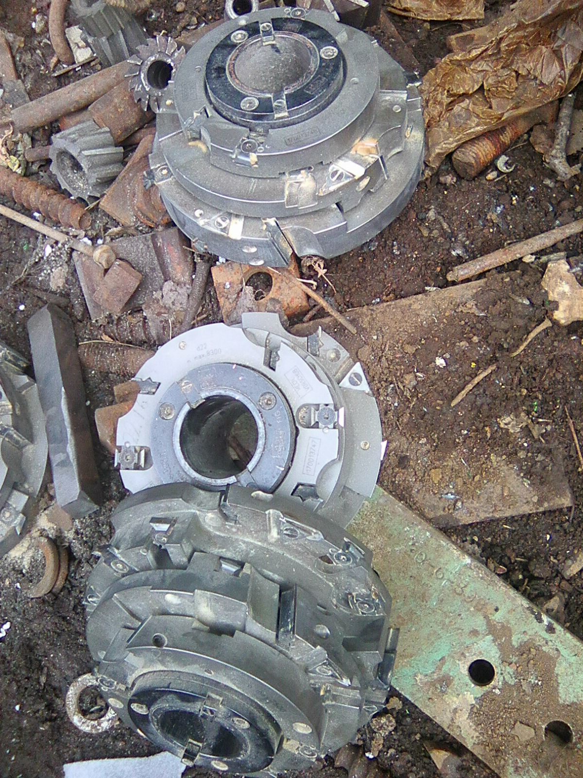 Střediokluky, HSS frézy Mo 5, nástrčné fr.,skládané frézy na dřevo s SK, válcové frézy pr.100, 200 dlouhé a poměrové váhy do 30 kg. Frézy jsou ostré, ne moc pomlácené. A pásový dopravník 6m.