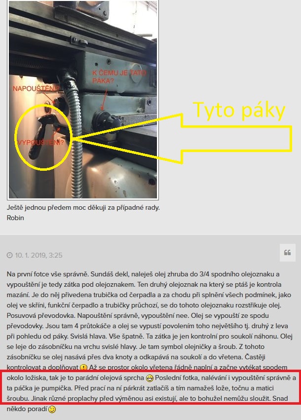 Dobrý den, nevím zda sem píši správně. Na fóru jako je tohle jsem prvně. Koupil jsem s tátou frézku Strigon ME 250 na domácí práce. Potřebujeme ji teď dostat zkrz dveře a šířka stolu je větší. Napadlo nás natočit stůl do 45°, ale nepřišli jsme po 2h bádání kde uvolnit otoč stolu aby s ním šlo pootočit. Zde na fóru jsem dohledal další věc a to tlačítko na levé straně stolu pro namazání lože. Na tom samém obrázku byla i jedna ze dvou pák, které se nám volně otáčejí bez jakéhokoliv odporu. Je možné, že právě těmi se uvolní stůl pro pootočení? Přikládám obrázek s označením páky. Jsou tam 2 na každé straně stolu jedna. V našem případě se volně protáčí v ose. Děkuji za rady.
