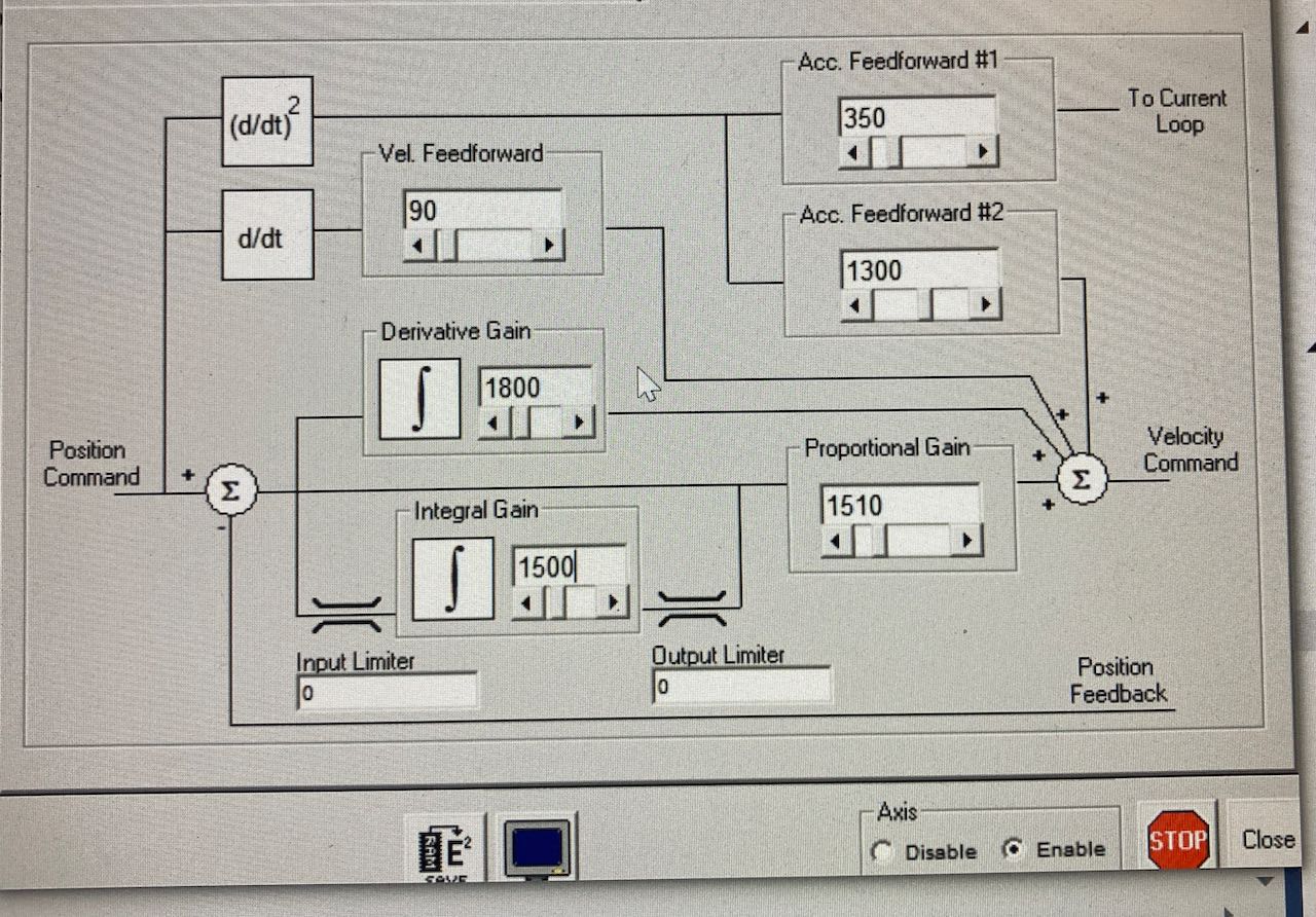 Jestli tohle neni zrejme a nepomuze k odladeni, zacal bych od zacatku a to nastavenim regulatoru (vsech tri) bud na default a nebo na "jednotkove" nastaveni a zacal nastavovat polohovy regulator do oscilace zvysovanim PID-P a pak ubral. Toto podle nektere z obvyklych ladicich metody - viz strategie Ziegler–Nichols. Potom ladil dalsi. Je mozne ze ten motor take saturuje vykonove/prudove a jednoduse na to momentove nema?