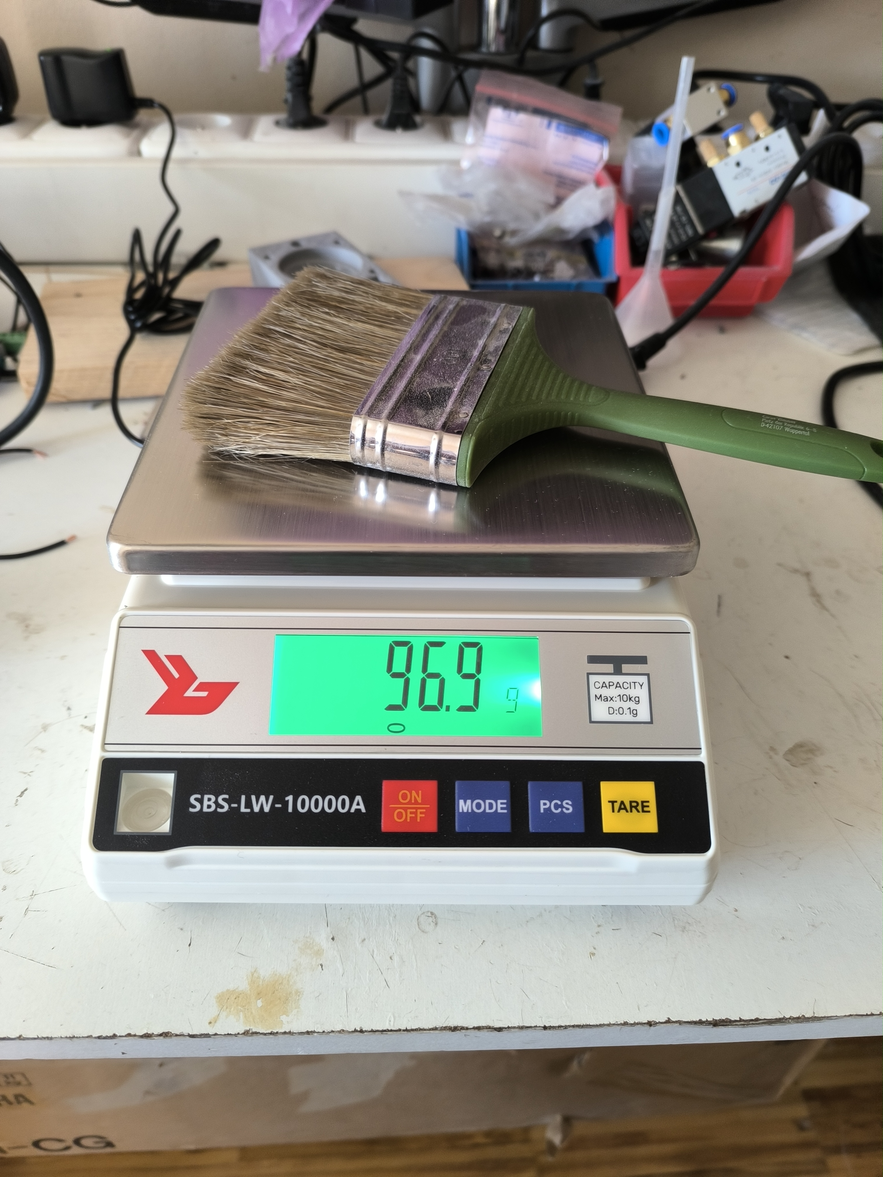 Tak přišla. Vypadá takto Nevypíná se. Opakované vážení štětce 96.9 až 97.0 g. Podle toho, jak jej na nerezovou podložku umístím. Když je na váze předmět, rozsvítí se podsvícení. Zelený displej s číslicemi 25 mm vysokými. Za mne naprosto přesně to, co jsem chtěl a za rozumné peníze. Signalizuje, zda je vyvážená (symbolem v dolní části displeje). Po zapnutí se hodnota cca dvě minuty hýbe, avšak v případě toho štětce to bylo o cca 0,1 gramu.