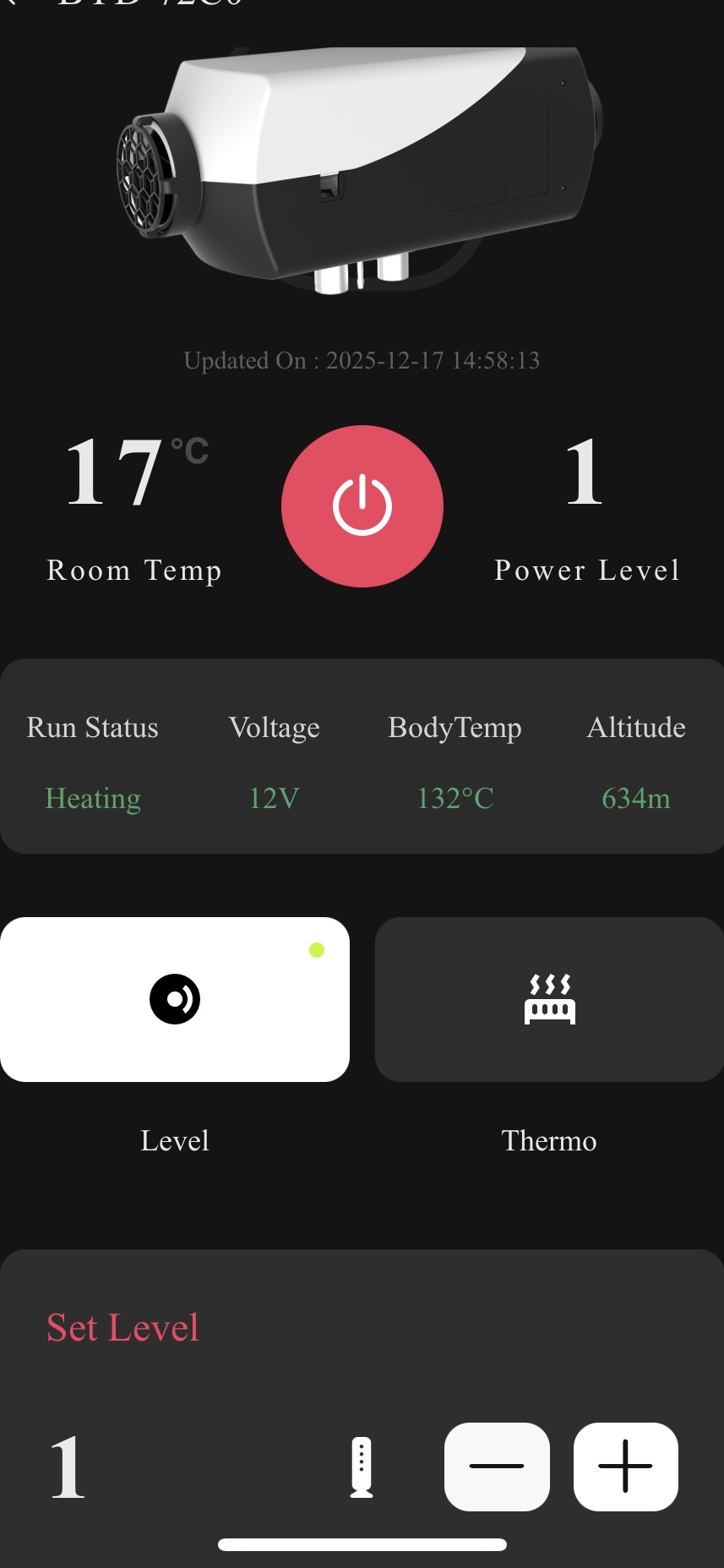 Moje auto má naftový príhrev motora Eberspacher, ktorý raz ide a raz nejde a funguje len pri naštartovanom motore. Zvažoval som investíciu do opravy a pripadny upgrade na nezávislé kúrenie. Avšak cena novej riadiacej dosky aby vôbec fungoval je 270€ a prerabka na nezavisle kurenie je ďalší náklad a kopec zasahov do systemu, rozhodol som sa pre naftový ohrievač Vevor 2kw. Zvolil som verziu s diaľkovým ovládaním a bluetooth pripojenim cez appku. Ovladaci panel umožňuje ovládanie rôznymi stupňami ohrevu, alebo sa prepne do režimu termostatu ako to je bežne doma.