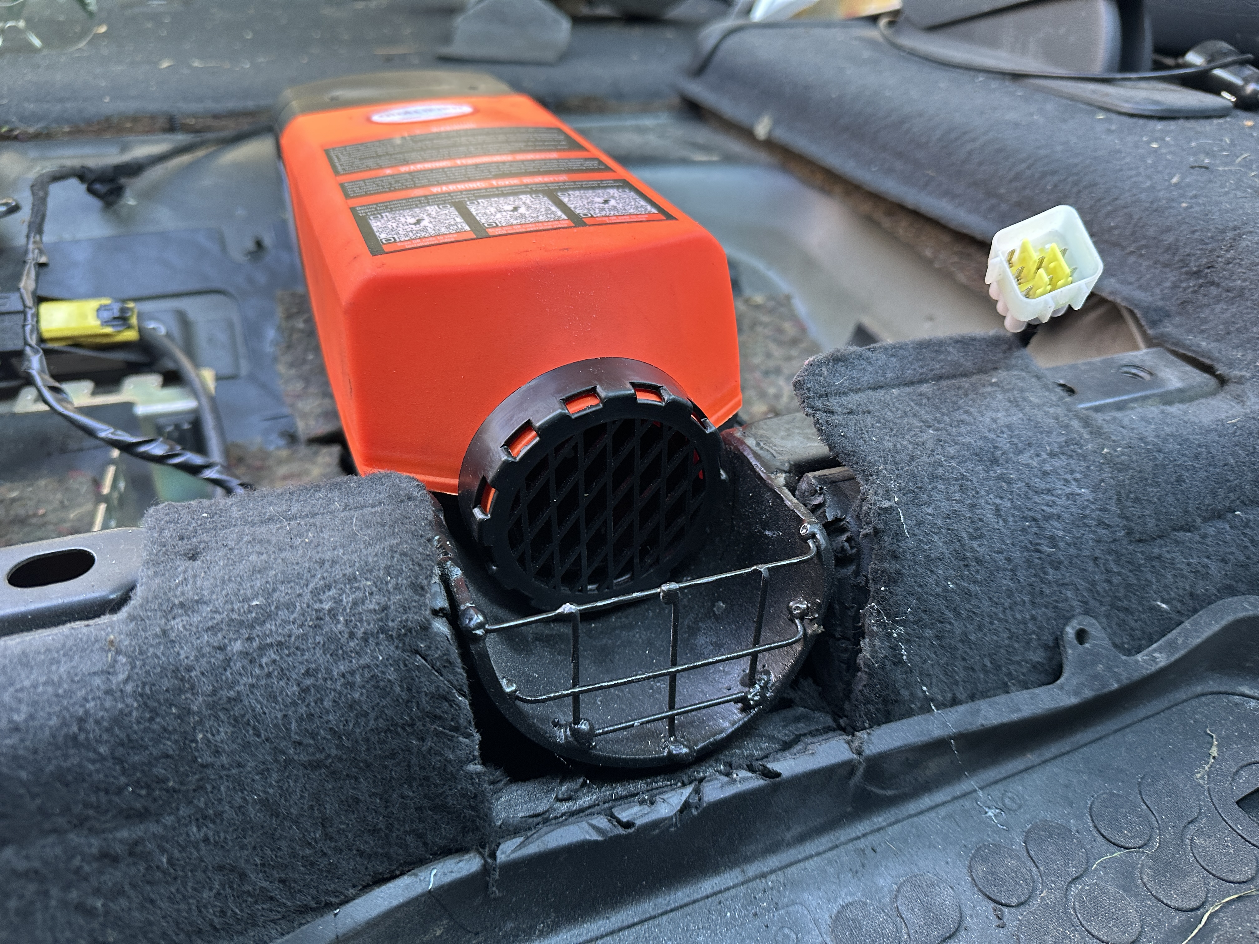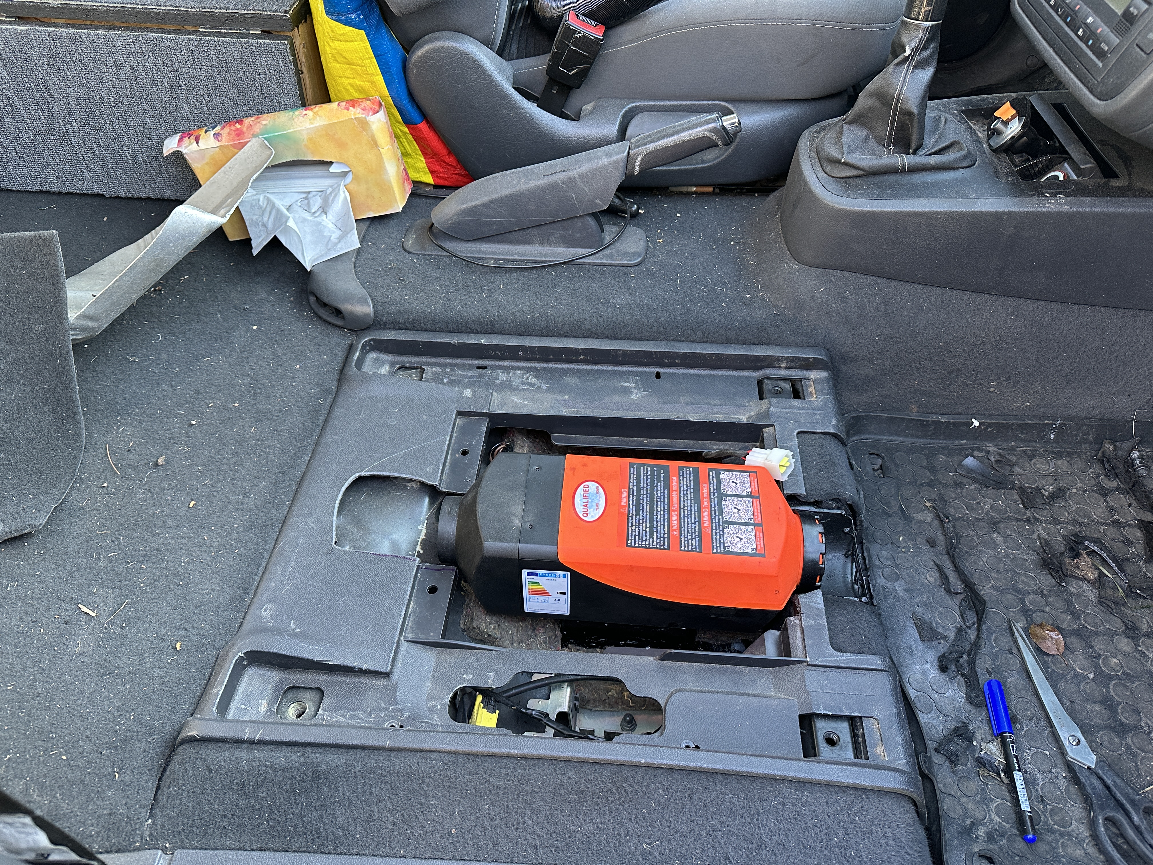 Nakoniec ostal medzi sedačkou a bufikom priestor 30mm aje to vpohode. Kryt bufiku aj tak nieje moc teplý. Vyduch je smerom dozadu a bude hadicou privedený medzi sedačky, kde si budem môcť meniť smer fukania dopredu alebo dozadu. Na to musim kupiť Y-ko s klapkami. Naftu budem odoberať z hadičky z nadrže ktorá vedie k čerpadlu pre existujúci bufik a dam tam rozdvojku. Je to blízko. Baterku šupnem do priestoru pod tú polpostel - je tam miesto. Musim už len doriešit jej nabíjanie cez nejaký činsky modul čo ju začne nabíjať až keď dobije altik hlavnú baterku na 13,2 V.