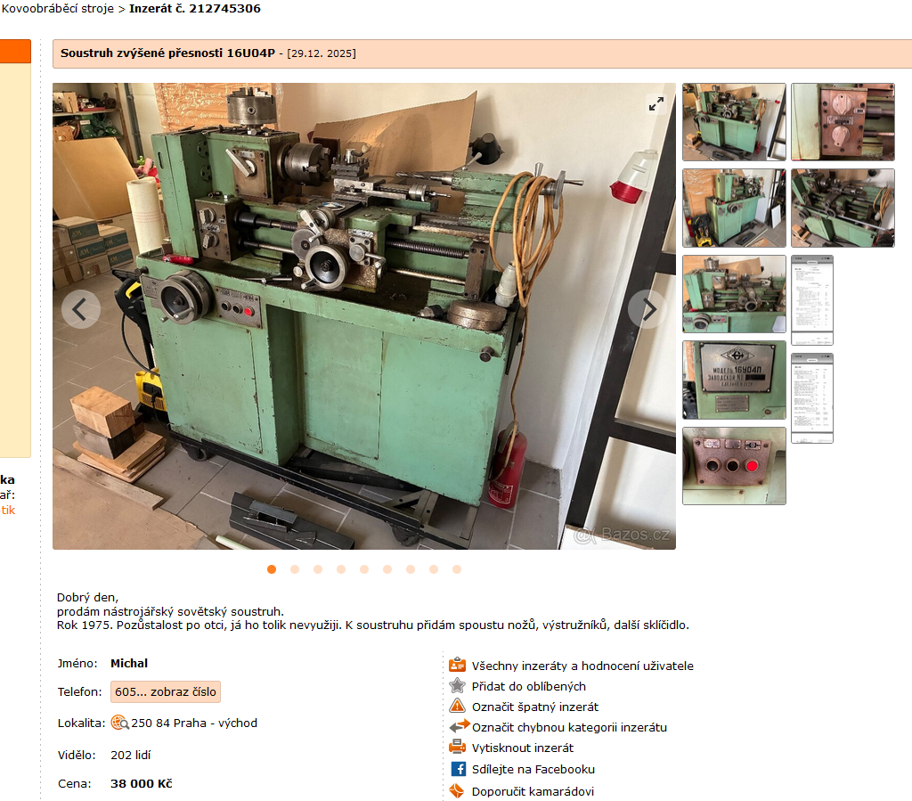 Tenhle je zajímavej soustruh, možná není tak velkej a težkej na stěhování a cena mi přijde také zajímavá. Pokud to není podfuk (jak občas bývají na bazosi - neoveroval jsem).