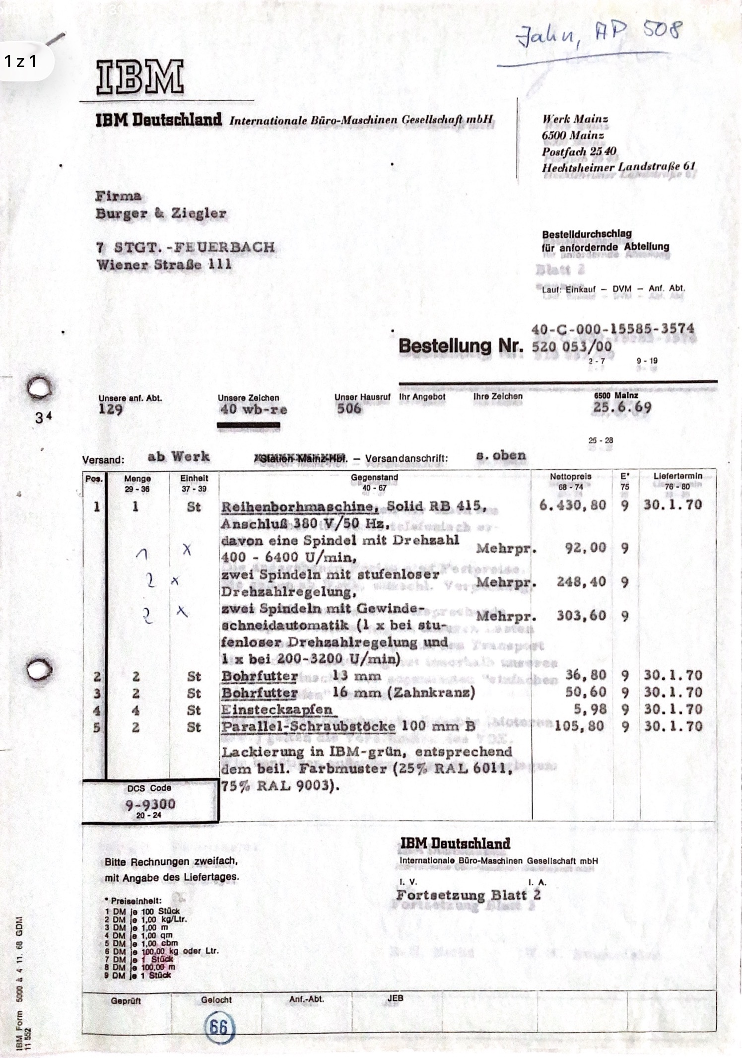 Jako zajímavost uvedu, že tenhle stroj z roku 1969 má stále původní dokumentaci, měřící protokoly a důvodové zprávy o nákupu. Původní vlastník totiž byla modelárna firmy IBM Deutschland a vedli si podrobné dokumenty. Celkem šokující je i cenovka 6500 marek. Dle německé inflační kalkulačky je dnešní přepočet těžko uvěřitelných 14300 euro.
