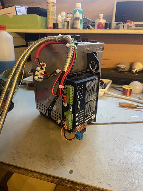 Tak jsem vyměnil kabeláž ke zdroji a driveru. Celé je to hozené ve spodním patře stolu soustruhu.