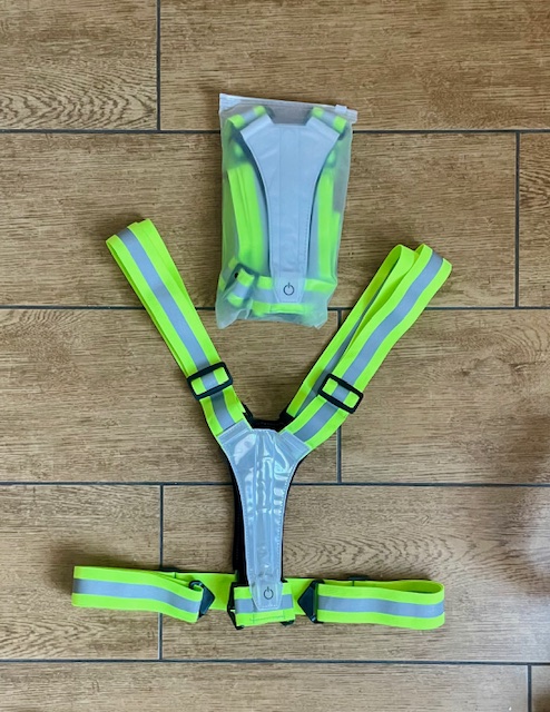 LED výstražný postroj - nabíjecí přes USB, jeden LED pásek v předu, jeden v zadu, oba jsou na sobě nezávislé a každé může svítit jinou barvou nebo i blikat jinou barvou, takže se můžete cítit třeba jako motocykl, vpředu svítit bíle a zezadu červeně