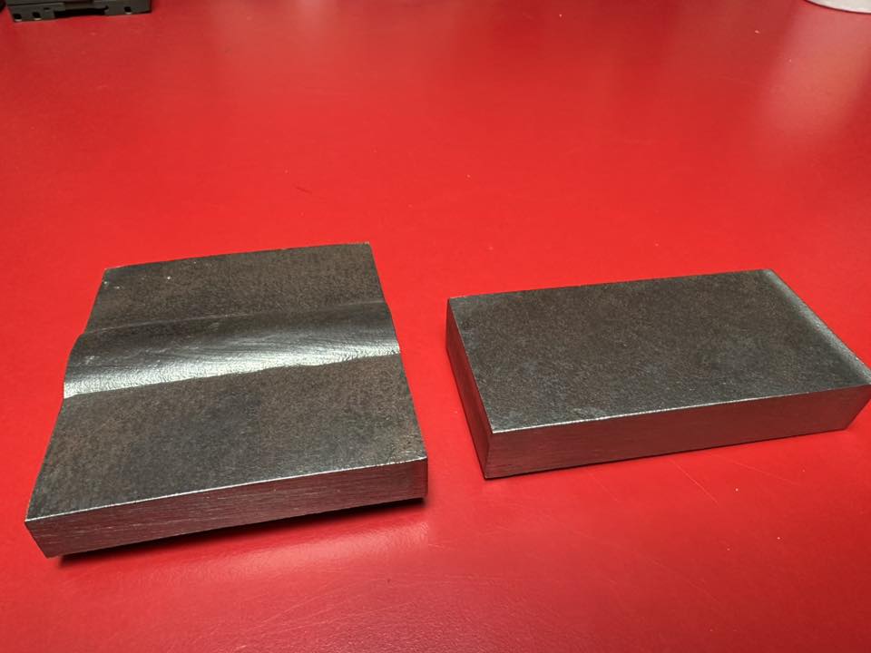 Nebudu vás napínat co to je, je to poslední pozůstatek staré kotelny, resp. parního kotle Sigma Slatina Brno VSP-1600 (2,5t páry za hodinu). Ten 14mm vzorek se svarem je válcová část a ten 20mm vzorek je čelní část (dýnko). Svařováno evidentně metodou SAW (pod tavidlem). Oba vzorky na moje přání vyříznul autogenem mistr palič Salám Doležal a já je následně na pásovce ohranil a očistil, aby i pozdější generace veděly, jak tlustou stěnu má bězný malý parní kotel