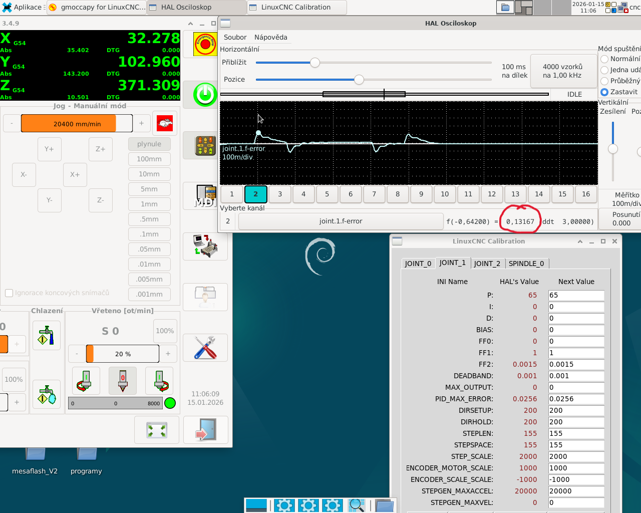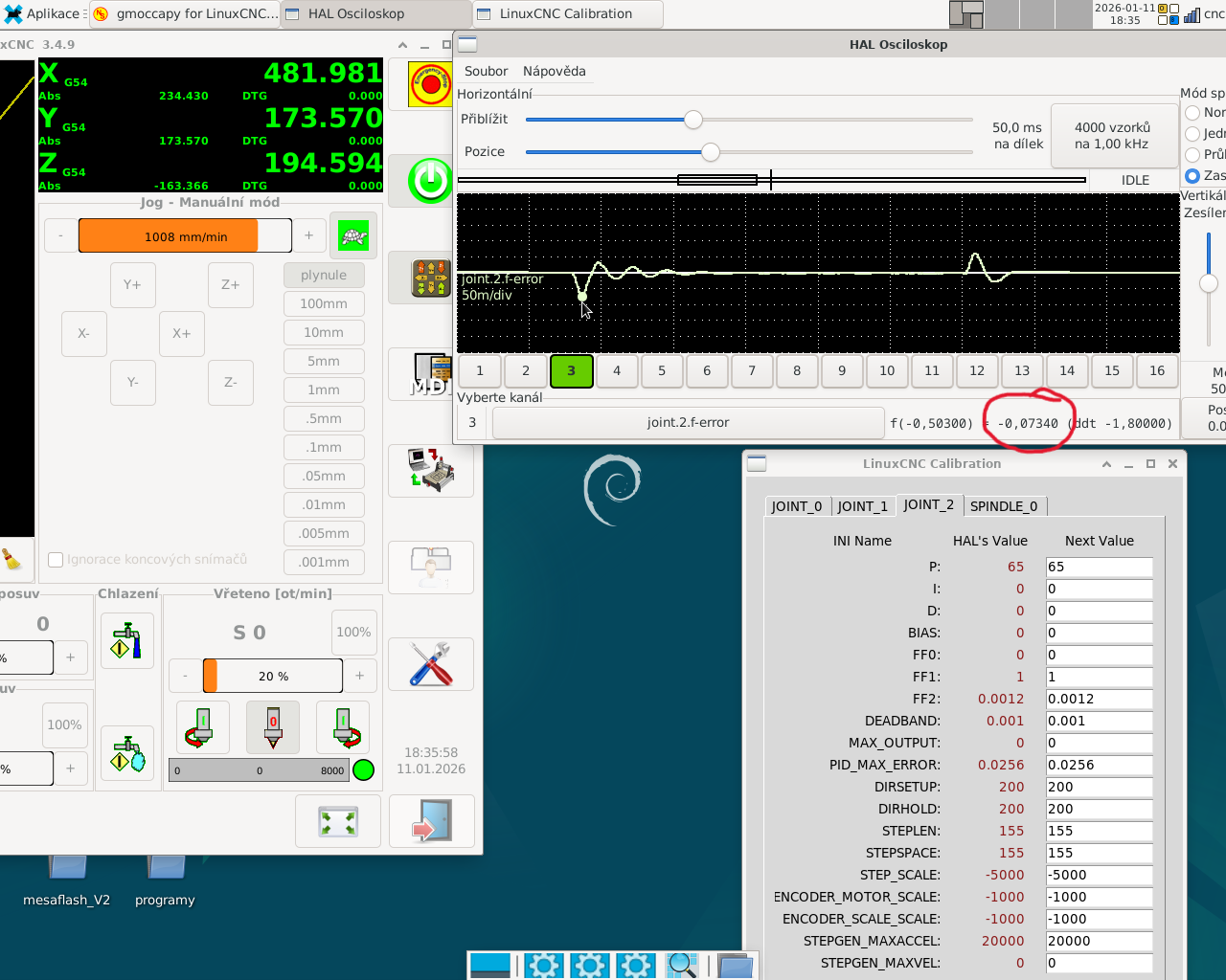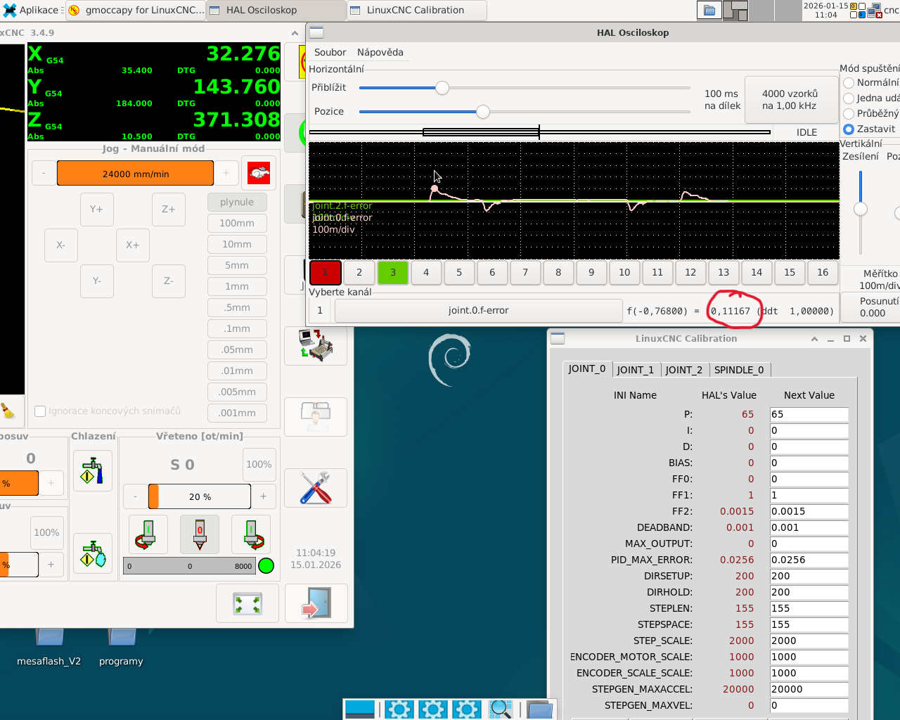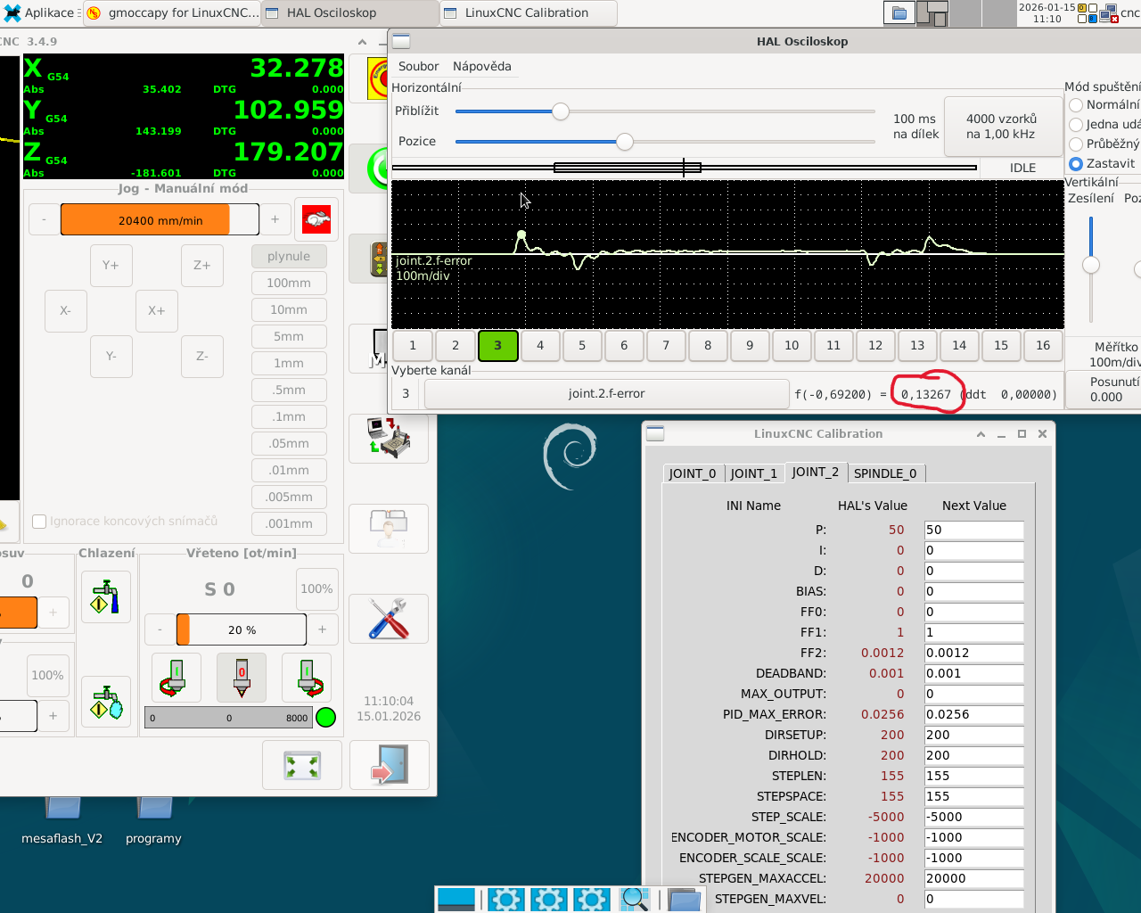 . Nakonec se jako nejlepší řešení ukázalo nastavit v LinuxCNC stepgen control-type 0 (přikazování v pozici), a posílat polohu z jointu přímo do stepgenu (bez PIDky) a do servodriveru.
