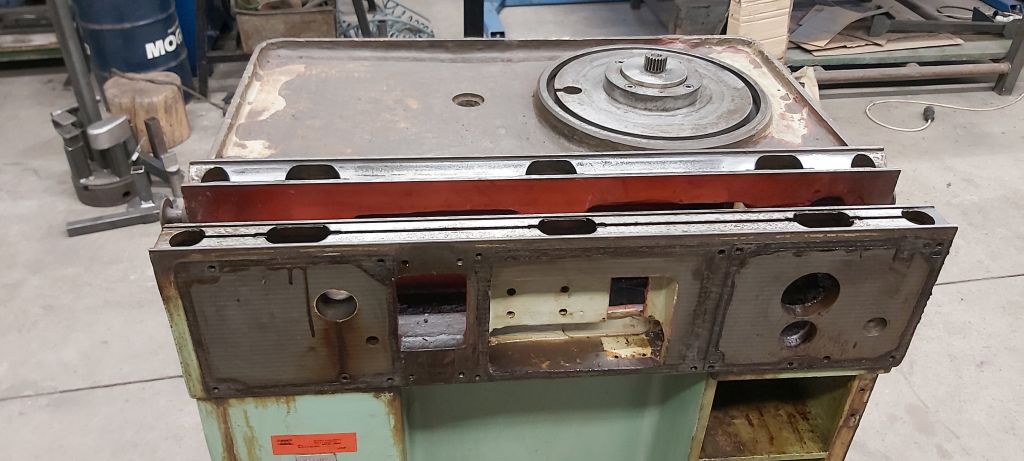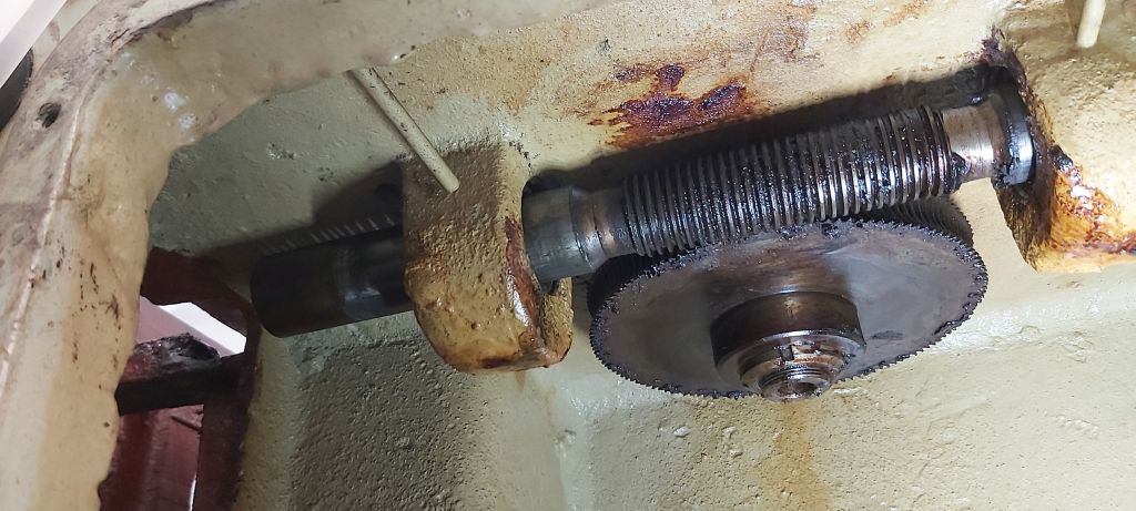 potom som si to ešte rozmyslel a vytiahnem aj šnekové súkolie na prísuv kotúča. celý stroj je zalepený hnedou hmotou, čo bola kedysi olej, resp.vazelína. všetko, čo sa má suvne hýbať a ľahko otáčať musím vyklepať kladivom.