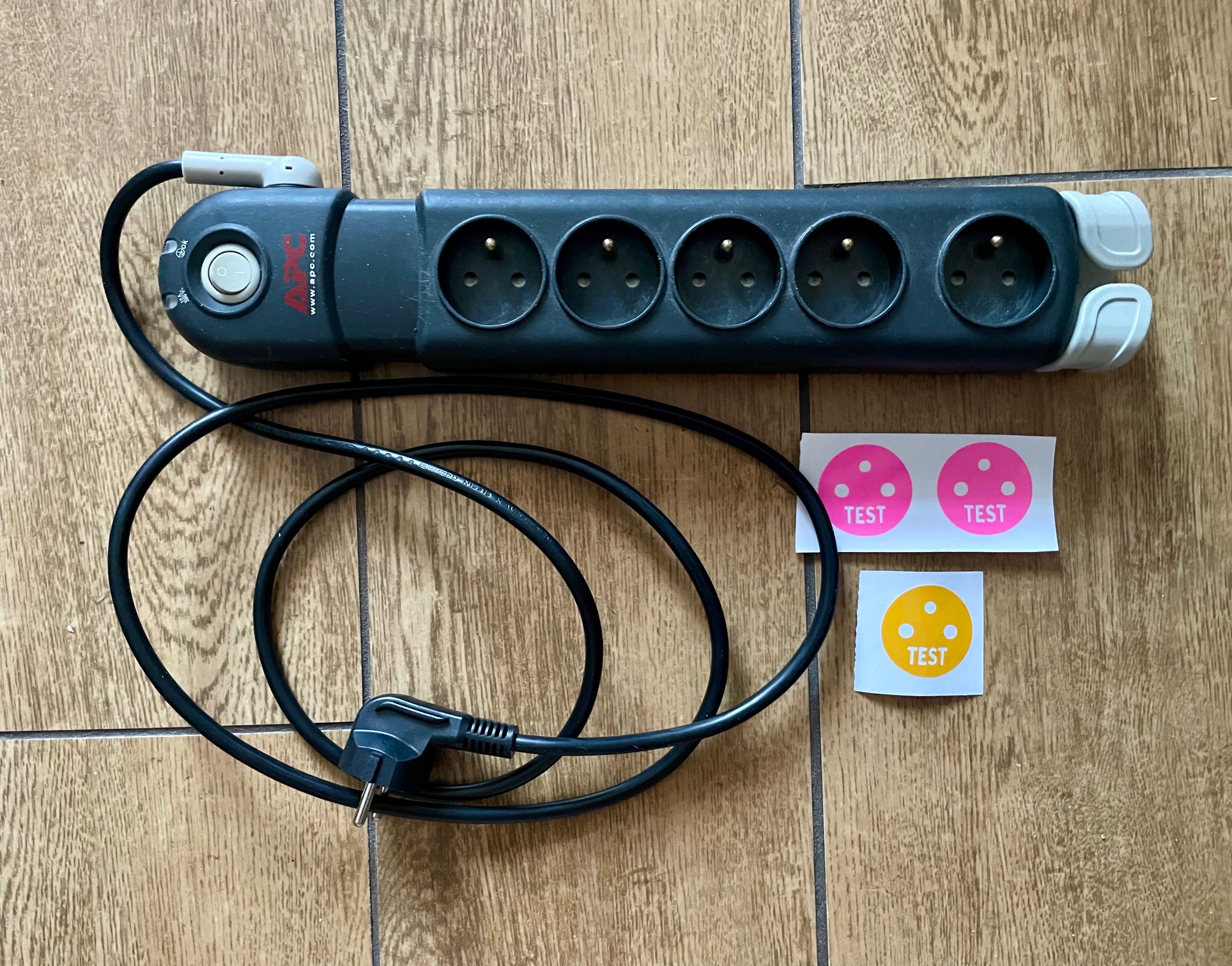 Takže pokud je tu ještě někdo, kdo by si chtěl vyrobit něco podobného, mám tady dva kusy této přepěťovky APC + k tomu samolepky do zásuvek (testovací zásuvku si musíte postavit už sami).