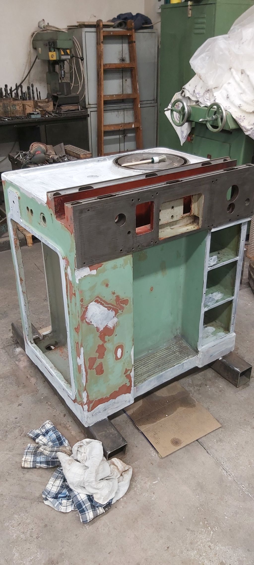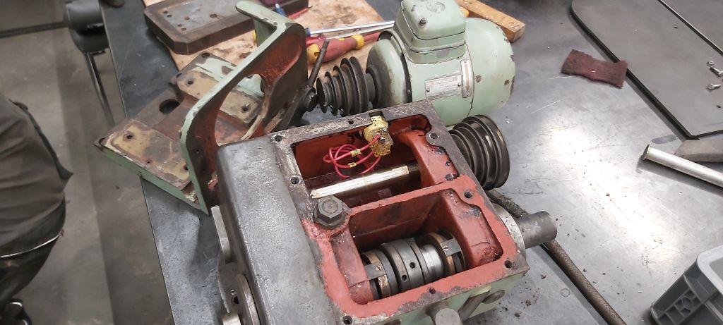 piest je na závit: základ je už oštrabaný, odmastený (väčšinou) a obrúsený od nesúdržných častí. To biele je základná farba tam, kde to bolo až na kov. No a pracovný vreteník - opatrne som ho rozobral, nech nevytečie olej a nezababrem pol dielne. Nevytiekol, nemal aký. Sucho ako na sahare.