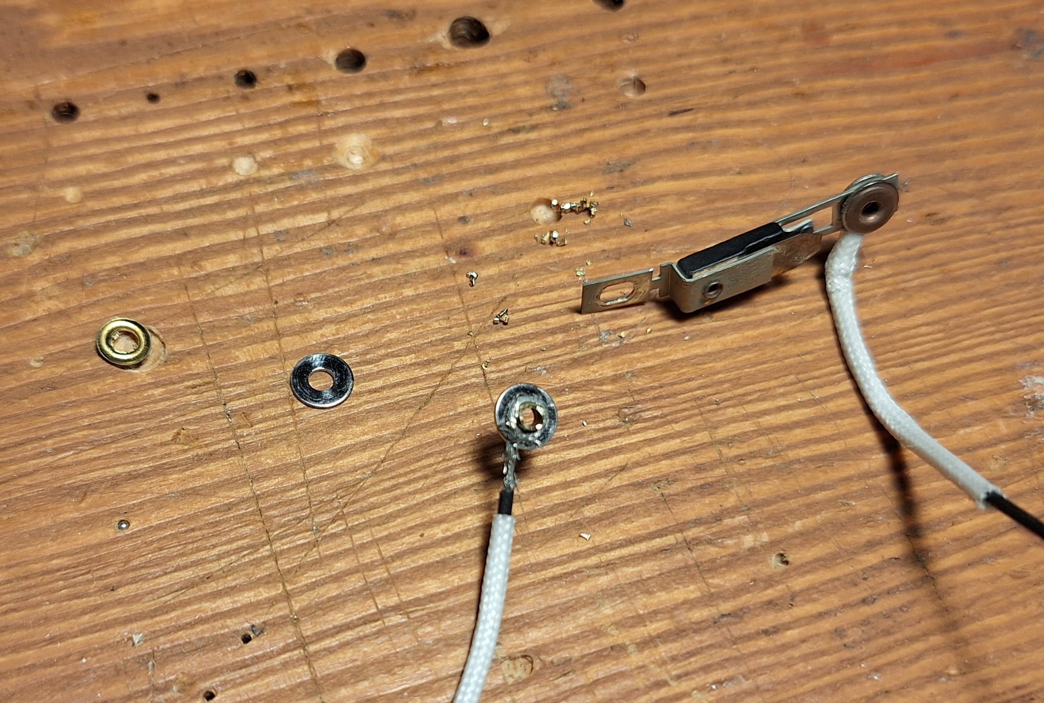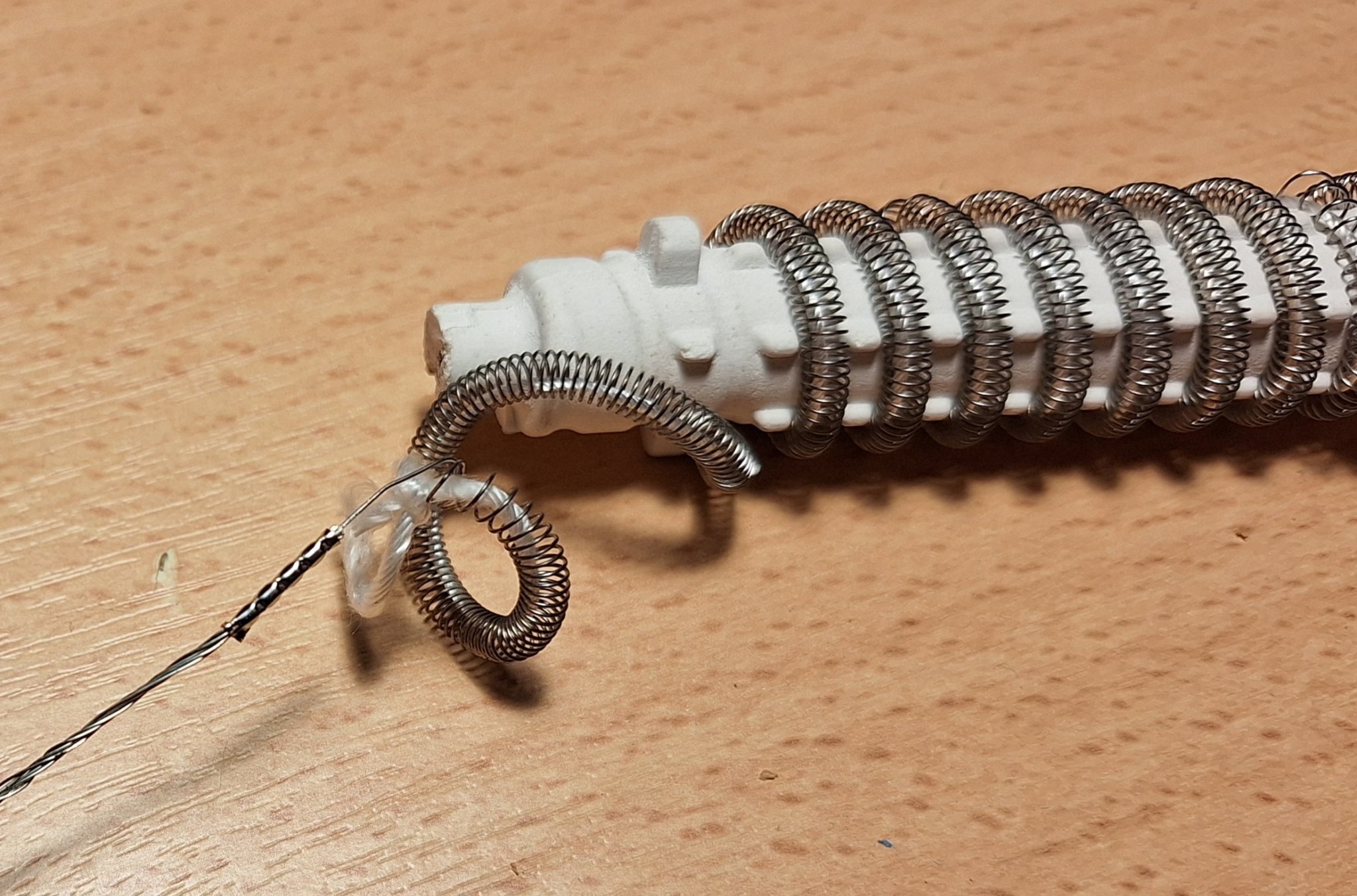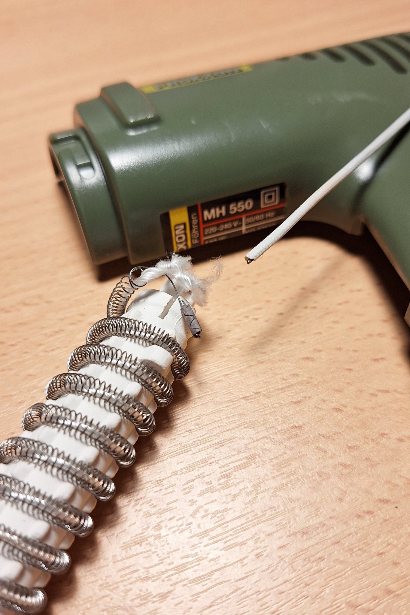 Přestala fungovat moje letitá oblíbená horkovzduška Proxxon MH 550, přerušil se drátek napojený na jeden konec topné spirály, vypadá to, že se mi jí povedlo spravit