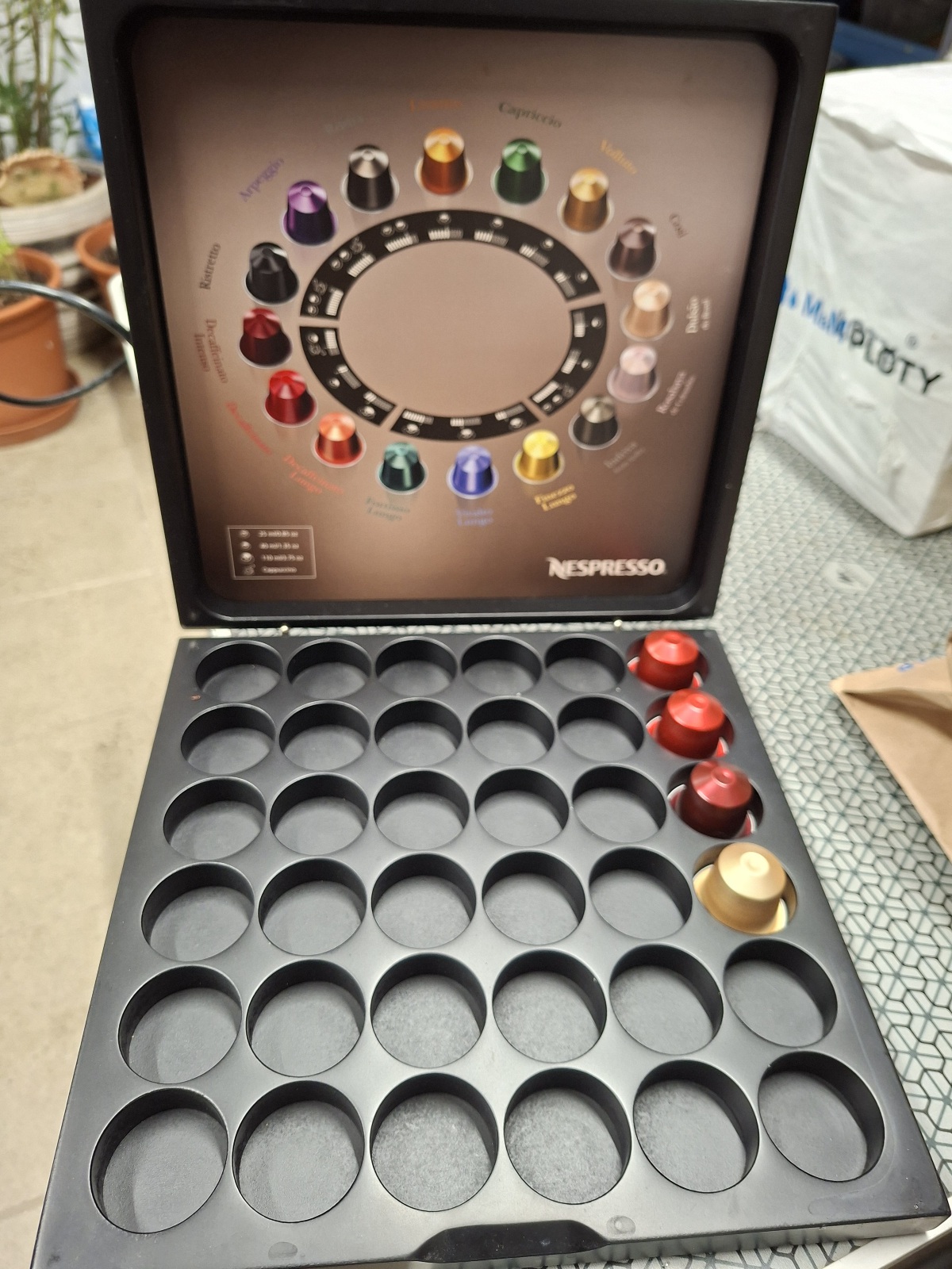 Pokracujeme. Nespresso kavovar a zasobnik na kapsle (jsou tam asi 4 archivni :) ). Funkcnost jsem nezkousel.