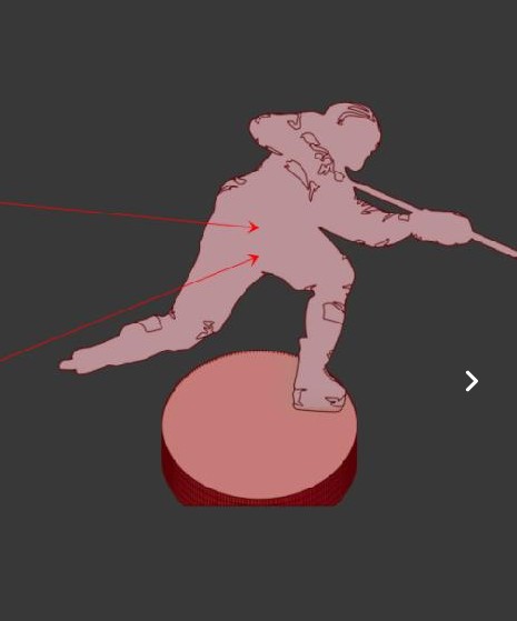 Plus vyřezat z 3mm hliníku figuru hokejisty (110mm výška) s drobným kapsováním (asi opět laserem) do hloubky cca 1mm.