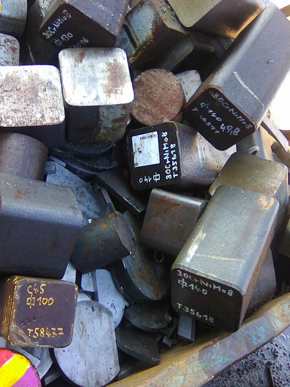 O kus dál, ve dvoře naproti malé chladicí věži, odřezky čtyřhranů 100, 130, 140 z C45, 30CrNiMO8, 42CrMo4.