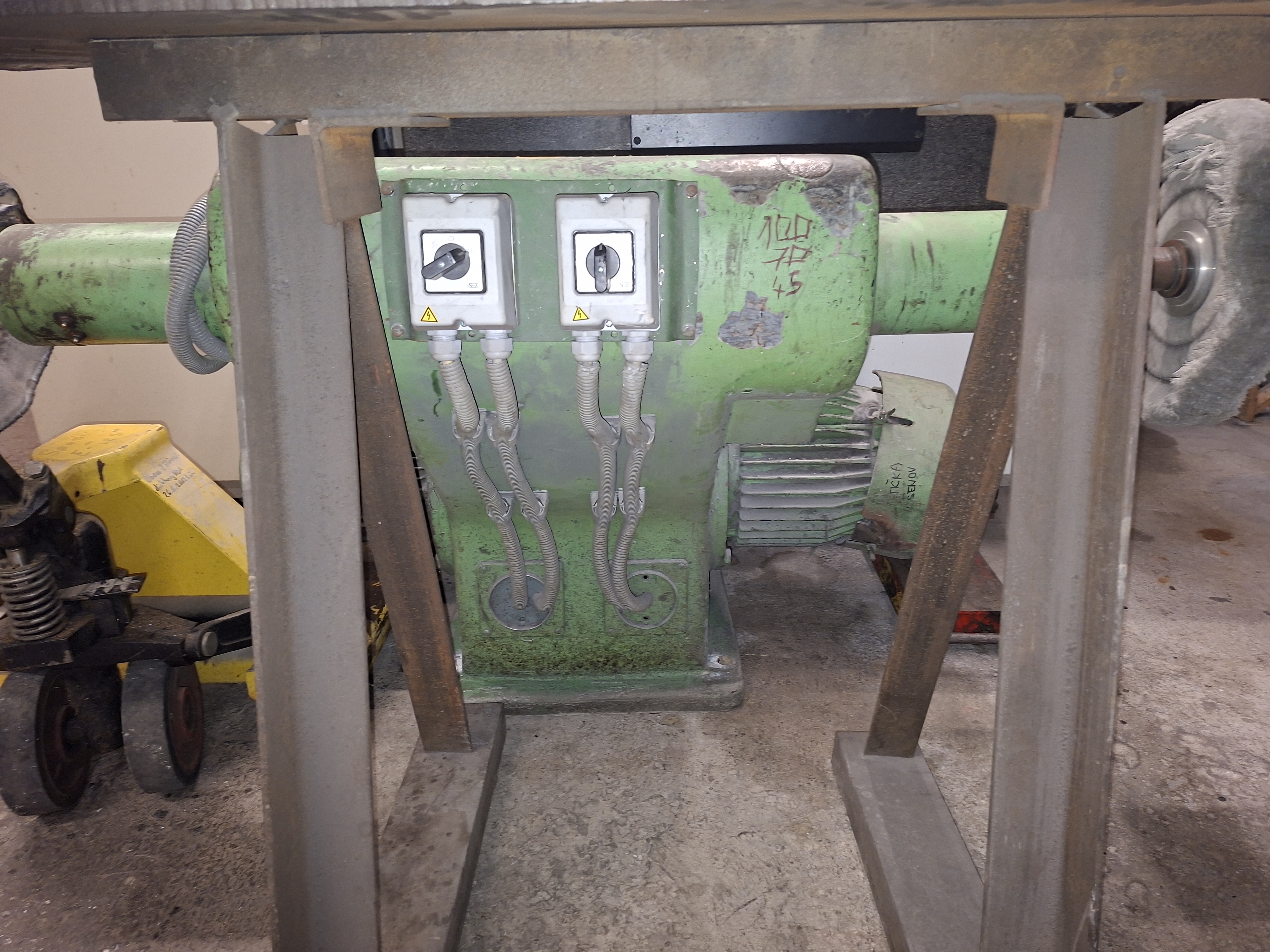 Dva nezavisle motory. Moznost menit rychlosti pomoci remenovych prevodu uvnitr.