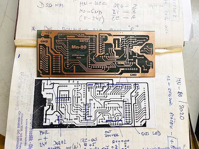Tak deska funguje a tady je nový plošňák. Akorát bez nepájivky, neb jsem někam uklidil UV světýlko a ta maska se musí svítit docela hodně. Už jsem plně opustil fotocestu a vše dělám fiber laserem. S přehledem zvládá 8 mills spoje.