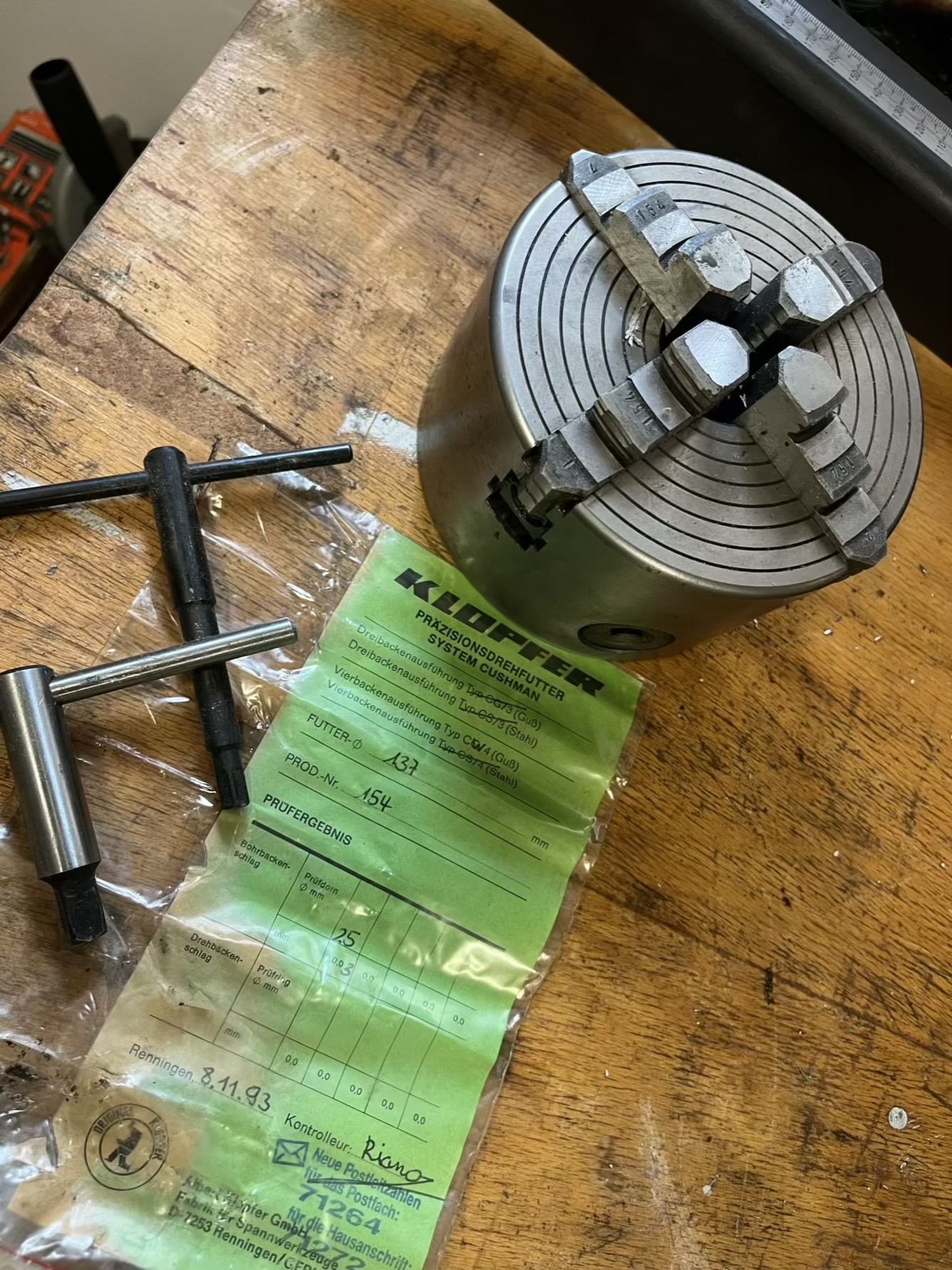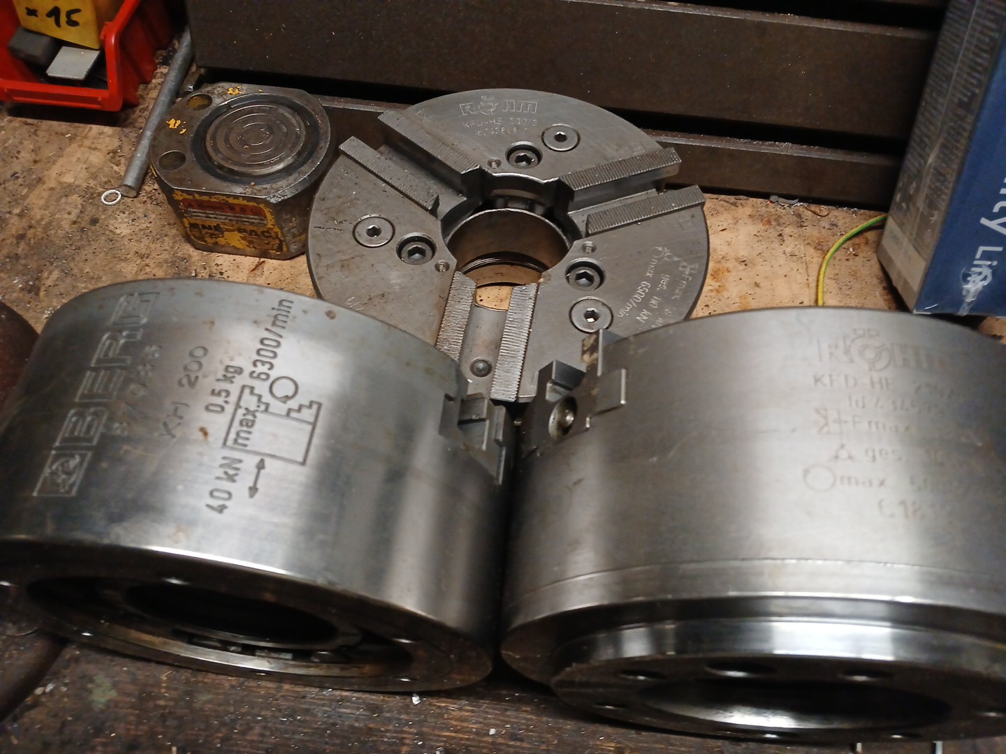 Sám jsem si takhle dělal sestavy na čínu (kužel). Jedna univerzála 4-paknová, pr. 130 mm, nezávislé čelisti. Jedna 4-paknová pr. 160 mm, závislé čelisti. Kleština C5, pr. 130 mm, kleština ER40, 130 mm. Obě běžej opakovaně ve stovce (to znamená, že na stovkových hodinkách běhá ručička v jednom dílku). Všechny koupené příruby jsem si musel upravovat sám, kužel neseděl, jak měl.