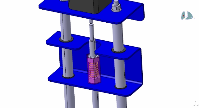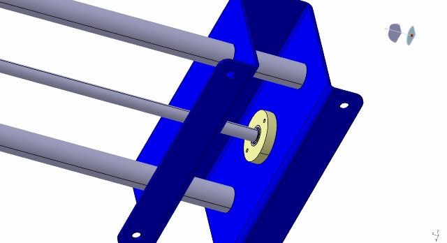 Pohybový šroub je vyroben (a teď mě nekamenujte) z pozinkované závitové tyče M8x1.25. Pro mé potřeby snad bude dostačující. Matice by měla být předepnuta pomocí vinuté tlačné pružiny (viz obr.). V případě, že se tato volba neosvědčí, bude tyč s metrickým závitem nahrazena tyčí s trapézovým závitem, doplněným předepnutou maticí.