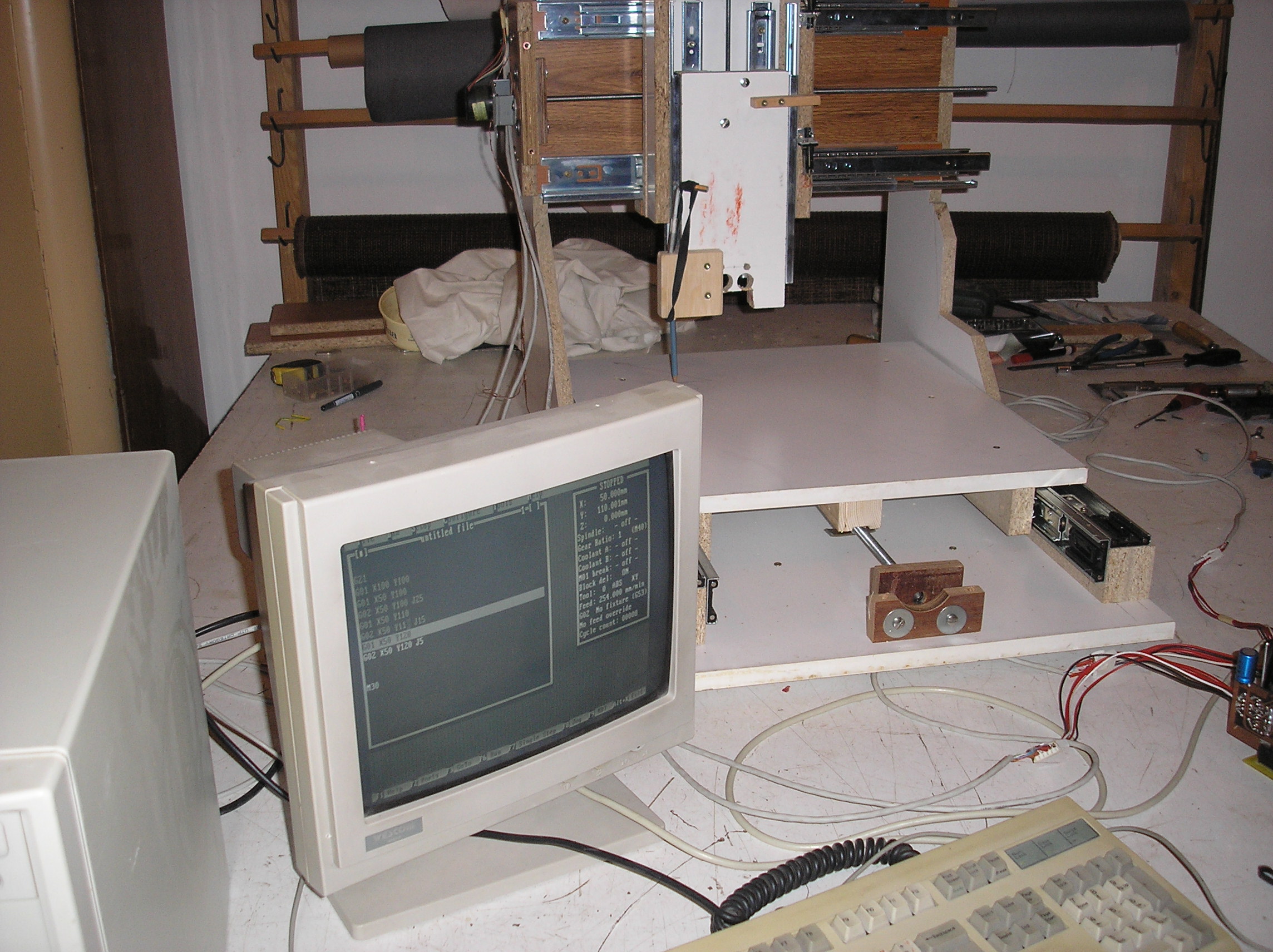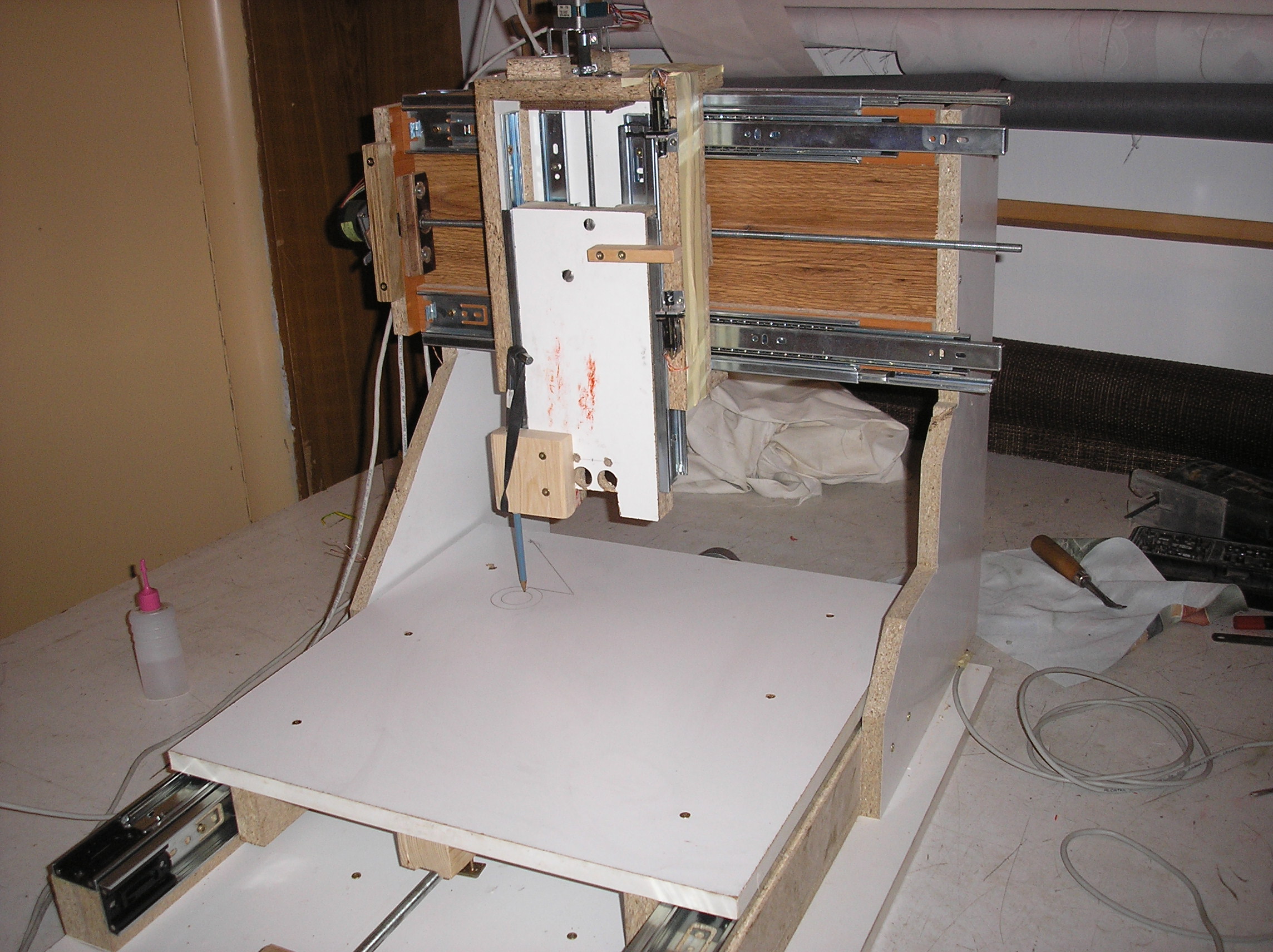 Tak se to dnes prvně samo pohnulo, Konstrukce z lamina, šuplíkové pojezdy, metrické závitovky, krokáče z tiskáren. Drivre 2x unipolár s 7026 a 1x 297-298 a zdroj 25V. Zatím to ovládám Turbo CNC-čkem.Jještě musím dodělat koncáky. Musím opravit vřeteno (Ferm 160W) a pak si začnu hrát.