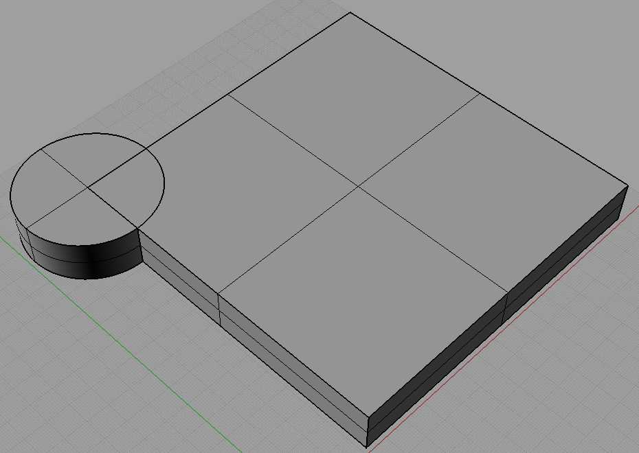 obr.1: Namaloval som hranol(150x150x20), aby to nebolo úplne ľahké, dohodil som mu do jedného rohu valec(polomer 30). Celé som to odsadil od súradníc (x,y) o 2 mm.