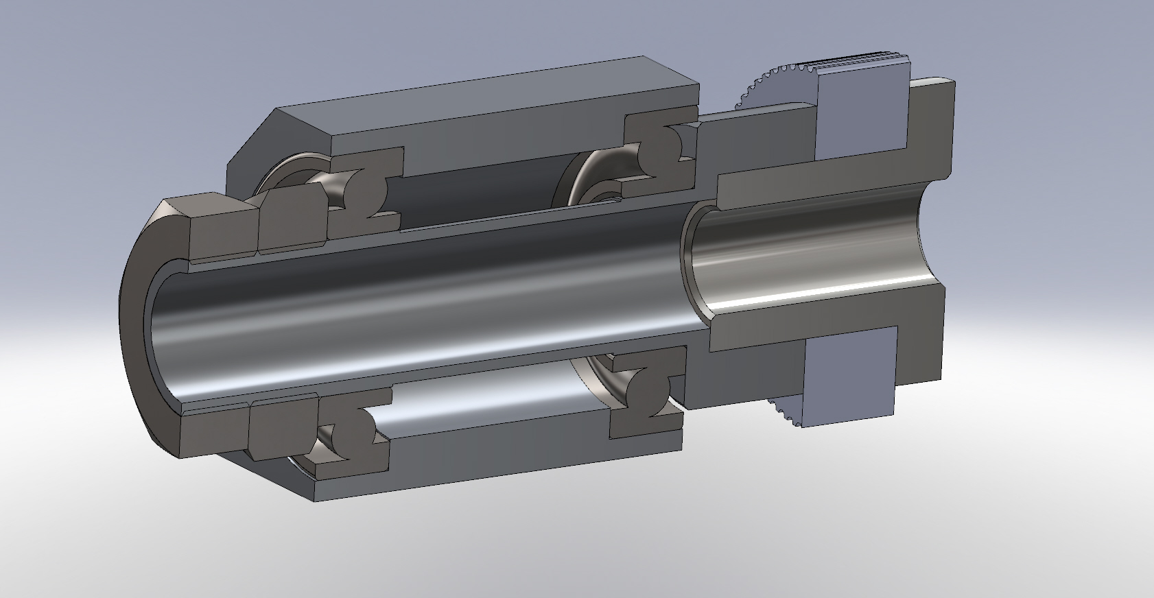 Takže půjdu jednodušší cestou. Chtěl bych to udělat tak jak to je na přiloženém obrázku jen s tím, že motor je otočen o 180°, Na stávající matici kterou mám v provozu mám použitá obyčejná jednořadá ložiska. Na nové bych chtěl použít ty ložiska s kosoúhlým stykem, jen nevím jak to druhé zajistit a stáhnout proti prvnímu, napadlo mě použít lepidlo Loctide 641 na rozebíratelné spoje. Přijde mi to jednodušší něž vyřezávat do odlévané matice závit, nehledě na to, že stejně nemám tak velký očka na závity. Máte s tím někdo zkušenosti?