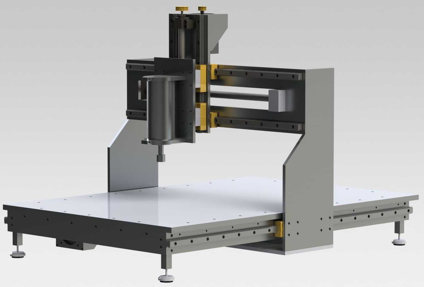 Vzdal jsem pojízdný portál, asi bude lepší jezdit se stolem. Prohlédl jsem milion fotek v galerii na CNCzone a nikde jsem neviděl zdvihání celého portálu. Myslím si že to bude konstrukčně tužší. Přeci jen je frézka z převážné části práce v nejnižším bodě. Matice vsadím do "noh" a šroub nějak dobře uložit v jednom bodě. (Motory jsou tam zatím jen ilustrativně)