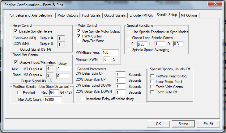 Pokud jsem to pochopil, tak v motorech je třeba nastavit motor 5 jako spindle a dát mu 1 krok, max otáčky a nějaké to zrychlení. Já mám 1/4060/500. Ve Spindle v Machu dál max otáčky rozsah 0-4060ot a pak začnu konfigurovat PWM. To jsem měl udělat tak, že pro S2030, tedy 50% otáčky by mělo výstupní napětí jít 5V. Pro 4060ot pak 10V. Na měniči jsem dal rozsah 0-10V (bylo 0-5V s vestavěným potenciometrem) a jakož takož to jede. Zkoušel jsem různé kmitočty na PWM, ale je to stejné jako pro 5h tak i pro 500Hz. Porstě mi z toho leze vyšší napětí. Jakmile se sepne vřeteno, mám na PWM 2,3V navíc a ještě to kolísá. Kdybych aktivoval stabilizaci otáček před zahájením Feedu, tak se mi mašina nerozjeze ani s nastavením 80%, tedy kolísání je vyšší než 20% Minimální otáčky mám ne 10Hz (580ot), jak je nastaveno na měniči (s potenciometrem na měniči funguje správně). Prostě je to na prd.