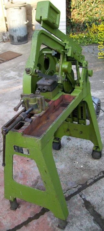 Hlavní řemeny mám Z 1570Lw 10x1550Li Z 61, lépe by se dávaly tak o 50 mm delší, ale pasují dobře. Úskalí je, že nevím, zda je původní malá řemenice a motor, je maďarský. Originální chlazení nemám, dal jsem tam malé zubové čerpadlo, které pohání O-kroužek, při těch otáčkách a stavu čerpadla to dotlačí tak akorát. Nádoba je uříznutý plastový kanystr, pod odtokem v něm stojí sklenička jako přepad na zachycení pilin. Výhoda je, že stačí necelý litr kapaliny. Přestavitelná čelist svěráku už nedržela v drážkách a tak jsem přidělal na rám matici a svěrák svírá dlouhý šroub. Další úpravou je šroub na pomalé spouštění do řezu aby se daly řezat slabostěnné profily. Na konci závitové tyče je ruční klika a tou se přidává :roll: Když jsem pilu přivezl, tak byla ohnutá hřídel pod řemenicí a ta šmajdala, osadil jsem ohnutou část a dal pouzdro. Dal ten jiný šroub svěráku a srovnal omačkané čelisti. Vrchní díl vedení rámu jsem zarovnal (měl už trochu drážky) a spodní snížil aby se zmenšila vůle. Vodící plochu ve spodním dílu jsem upravit nemohl, protože jsem to dělal na soustruhu. Už od původního majitele měla pila vzadu kolečka a vpředu našroubované nohy. Vůle na hlavní hřídeli není tak hrozná. Na klice je to horší. Na rámu jsem to trochu zlepšil tím, že jsem čep zajistil v rámu a nechal točit v ojnici, bylo to obráceně. Bohužel k "dokonalosti" by byla potřeba spousta věcí, např. opracovat celou frému, vyvložkovat nebo zvětšit většinu čepů, pořádně přidělat čerpadlo (teď tam drží svěrkou), místo provizorní závitovky dát trapézák a lepší páku na rameno, dát z boku vypínač, ale nejsou lidi a na frému a uložení ani možnosti. Celkem ale teď pila plní požadavky.