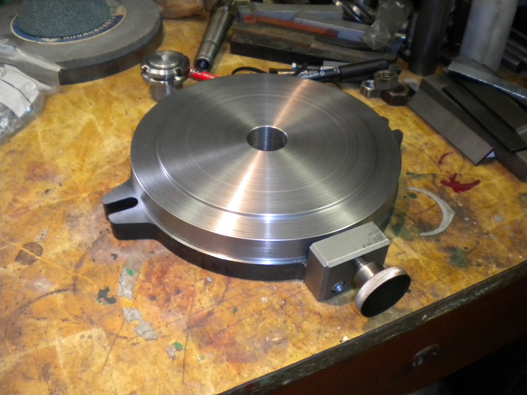 Moje provedení uchycení univerzálky. Stolek ještě není komplet hotový, zbývá zalisovat středový čep, navrtat díry pro uchycení sklíčidla a navrtat po obvodu kruhu 24 děr pro dělení.