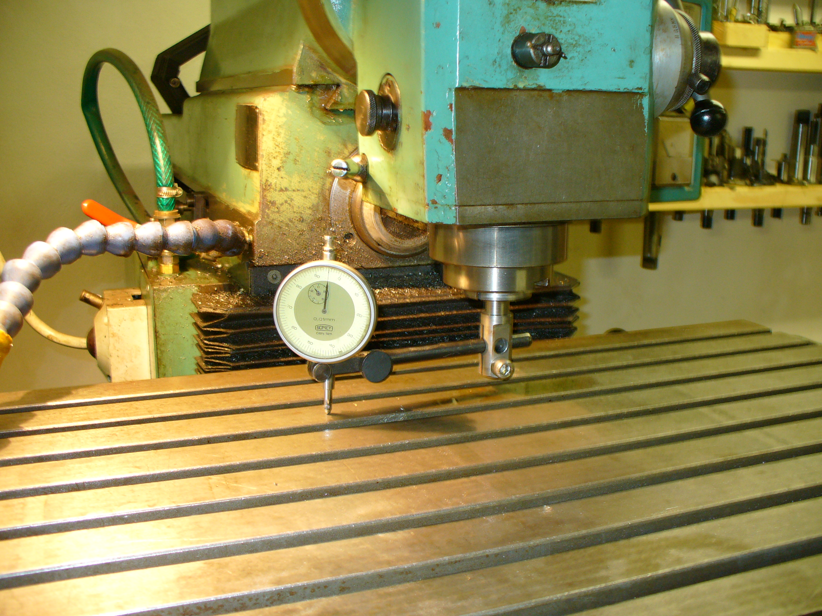 Jestli má ta mašina natáčecí hlavu, zkontroluj kolmost ke stolu. Místo nástroje kus broušené kulatiny, na stojánek hodinky a jezdit stolem nahoru a dolů a hlavu doklepat do +-0.
