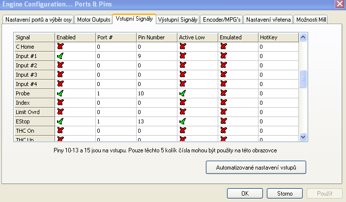 Jak říkám, je to stejné, při zadání portu 0 a nastavení na 0, E-stop reaguje na pin 2 a 3