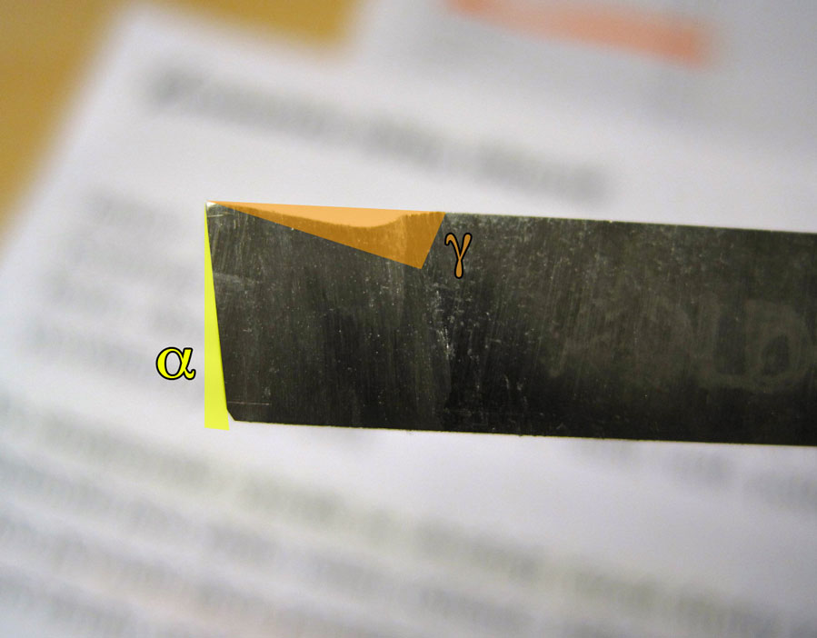 Já teda když upichuju, tak ten břit mám vždycky rovně, tak, aby se ta špona která se loupe odvalovala právě po tom rovném čele gama s nulovým úhlem sklonu lambda