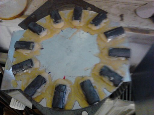 Bohužel nemám fotky. Jedná se o generátor bez plechů. Plechy mají jednu nevýhodu - i bez zátěže klade generátor odpor - známé cukání. Proto jsme zkusili postavit generátor, který se skládá ze 2 ocelových disků, na nichž jsou nelepeny vždy se střídavou orintací neodymové magnety. Tyto disky se otáčí. Jelikož jsou zde nesouhlasně orientované magnetické póly, tak mezi deskami vzniká silné magnetické pole. A v tomto poli mezi deskami je vložen disk statoru s cívkami. Díky tomuto uspořádání generátor klade odpor až když je z něj odebírán proud. Zatím jej testujeme a vykazuje překvapivě dobré vlastnosti. Při jeho testování jsem si uvědomil, kolik energie je potřeba vynaložit k rozsvícení blbé autožárovky - člověk musí máknout, když ručně roztáčí generátor.