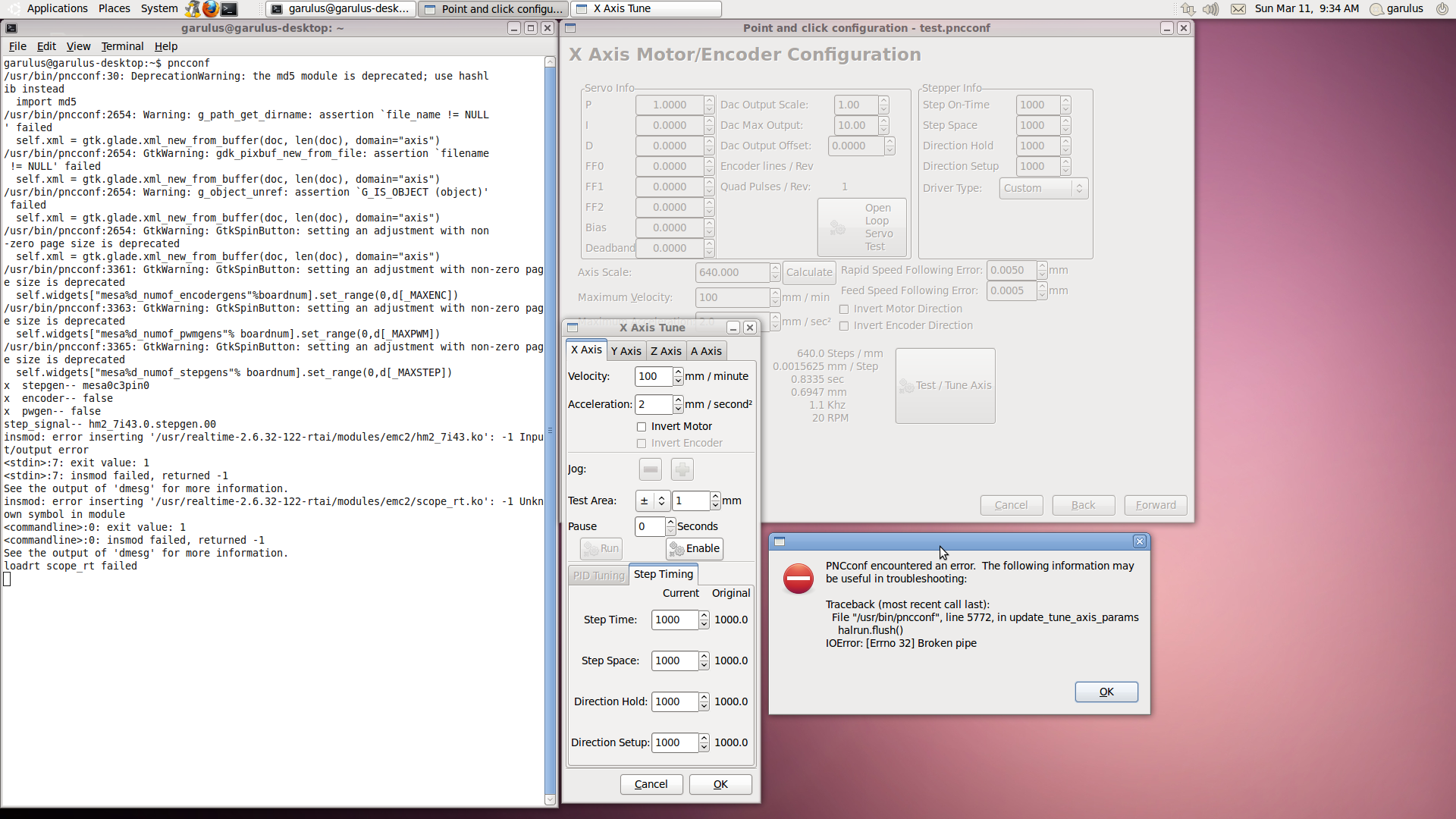Jestli čtu dobře -[ 343.560733] hm2_7i43.0: board at (ioaddr=0x0378, ioaddr_hi=0x0778, epp_wide ON) not found! - tak počítač nevidí kartu, možná zkusit jinej kabel na paralelním portu, popřípadě překontrolovat jumpery- musí to bejt nastavený na komunikaci přes paralelní port.